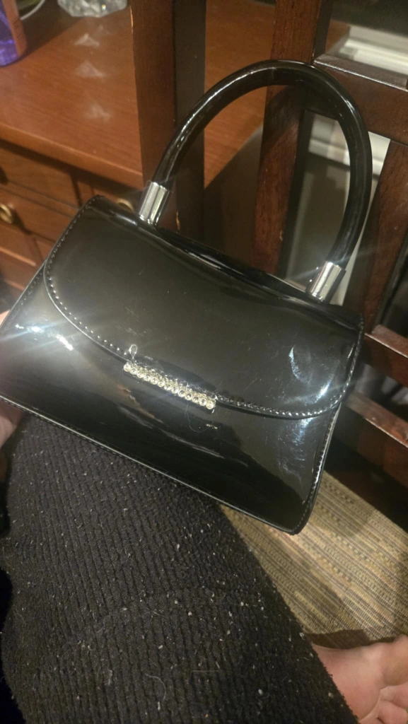 Selling a black handbag. It has a handle and a decorative row of rhinestones. It's in used condition.