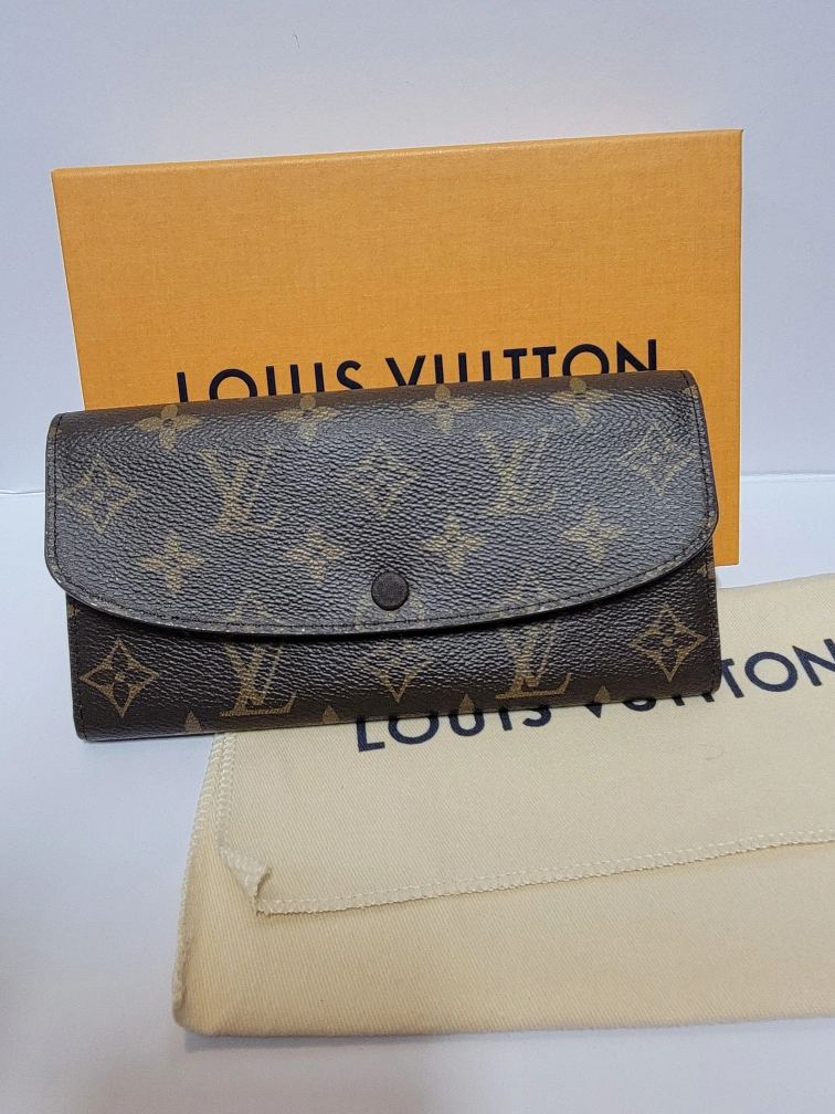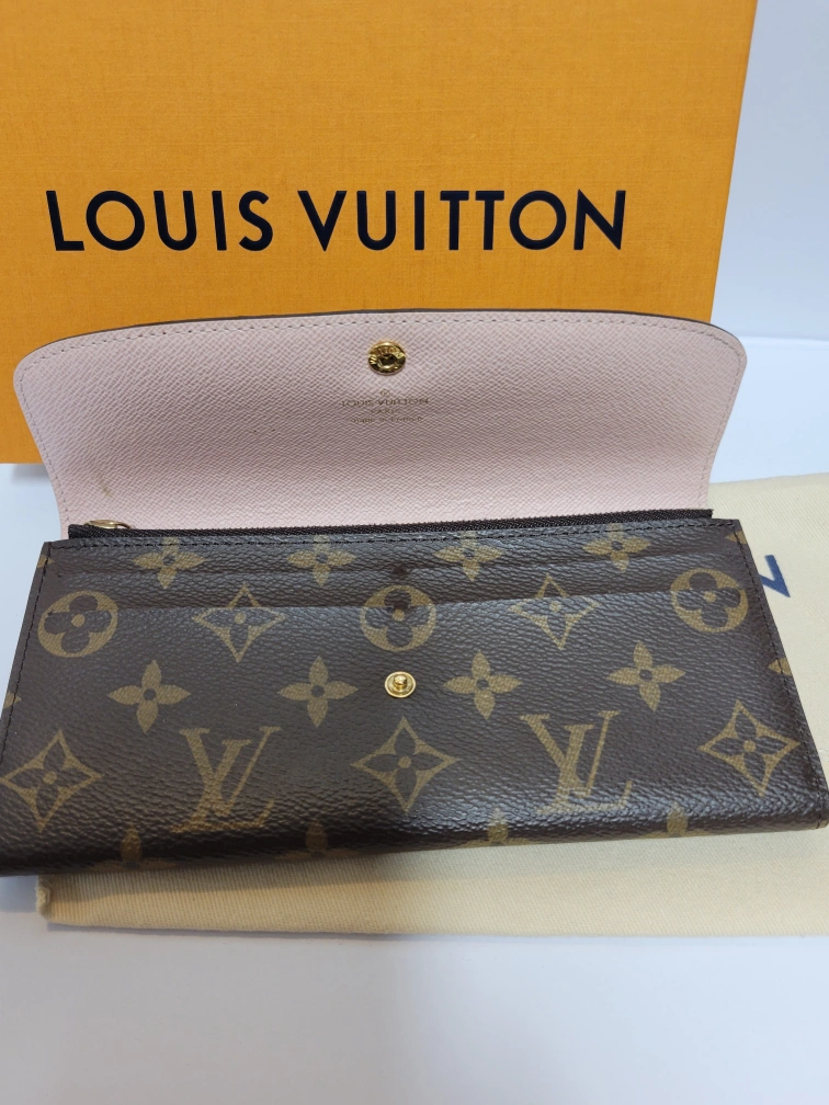 Introducing the Louis Vuitton Emilie Long Wallet in the delicate Rose Ballerine hue. This wallet merges practicality with exquisite design, showcasing supple monogram canvas paired with a fresh lining that exudes a touch of allure. Its versatile layout includes four credit card pockets, a zipper coin purse, a bill compartment, and a designated space for identification cards and receipts, while gold hardware and a grained calf leather lining elevate its elegance. The wallet comes with its own box. Dimensions: height : ~ 10.0 cm width : ~ 19.0 cm depth : ~ 3.0 cm The front button is supposed to be pink but it's faded so I colored it brown. Kindly review pictures carefully for flaws.