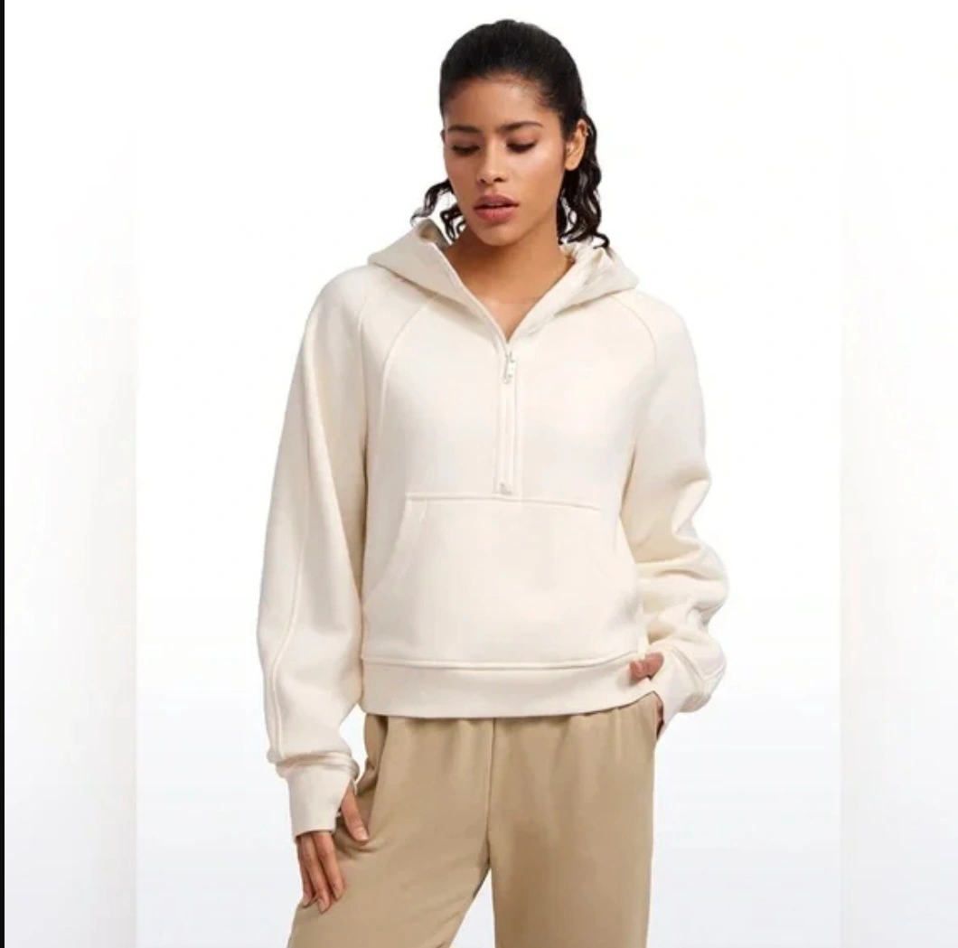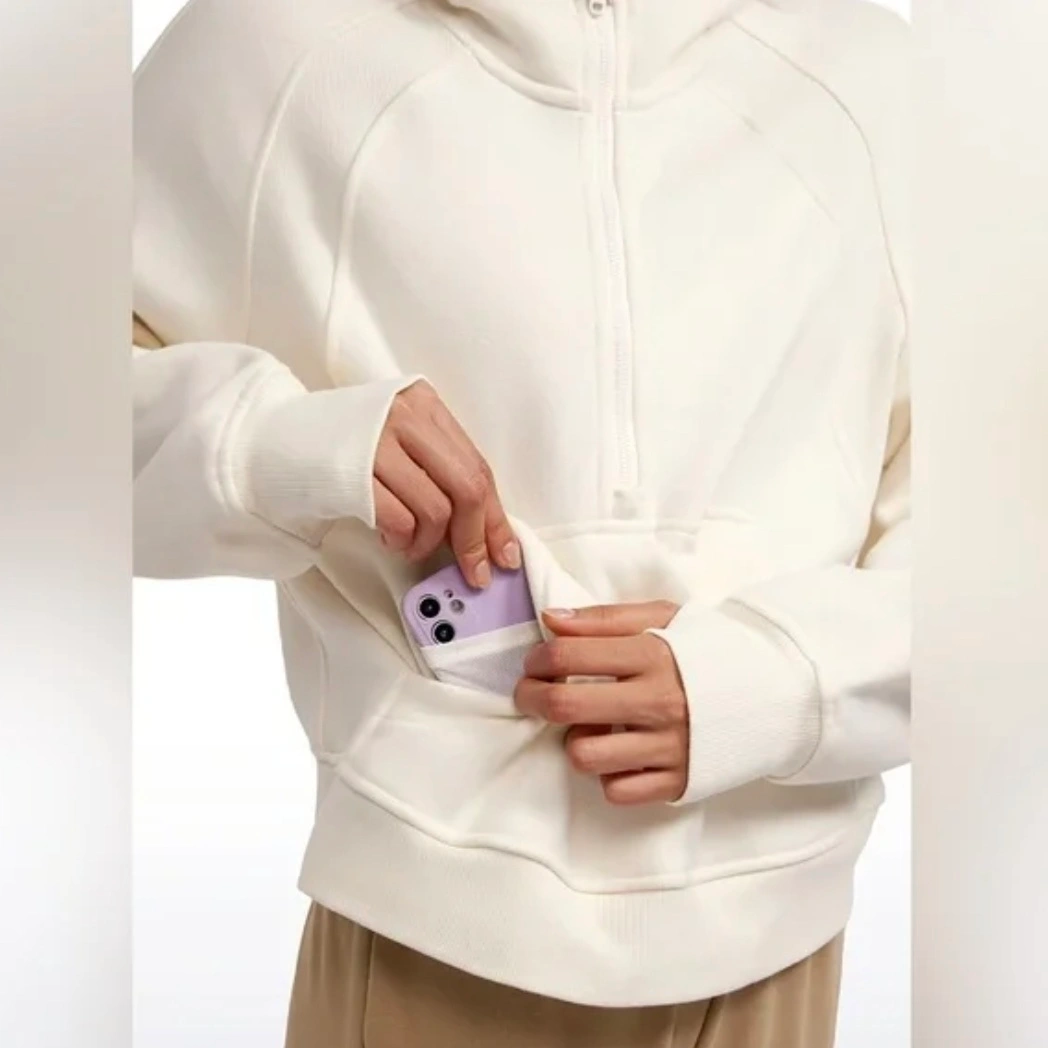 Selling a CRZ YOGA cropped half-zip hoodie in a lovely Black And Burgundy colour! It's Brand New and ready for a new home. Perfect for layering or wearing on its own. It features a convenient front pocket, too!