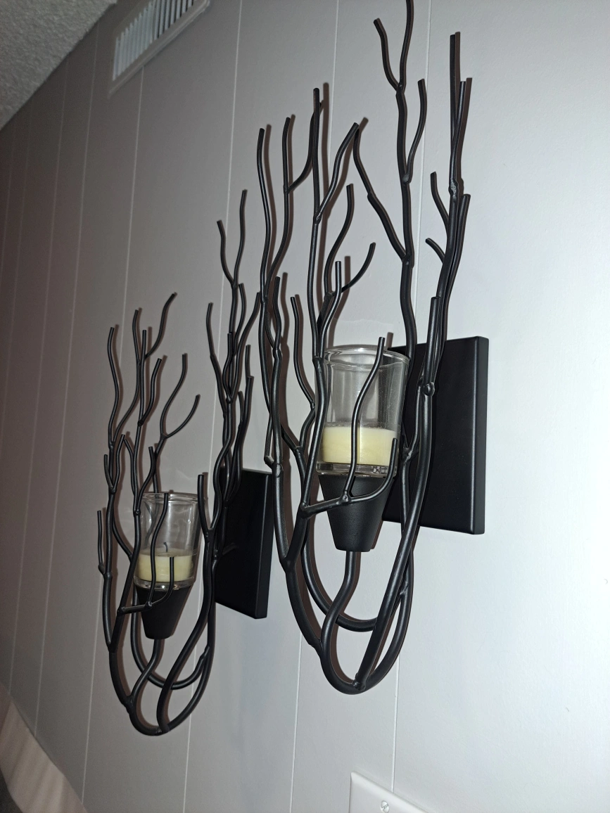 Here's a pair of metal candle wall sconces! They feature a unique branch-like design and would add a touch of rustic charm to any room. Perfect for creating a cozy atmosphere in your home. Candles are included! 19" long non smoking home cash only please