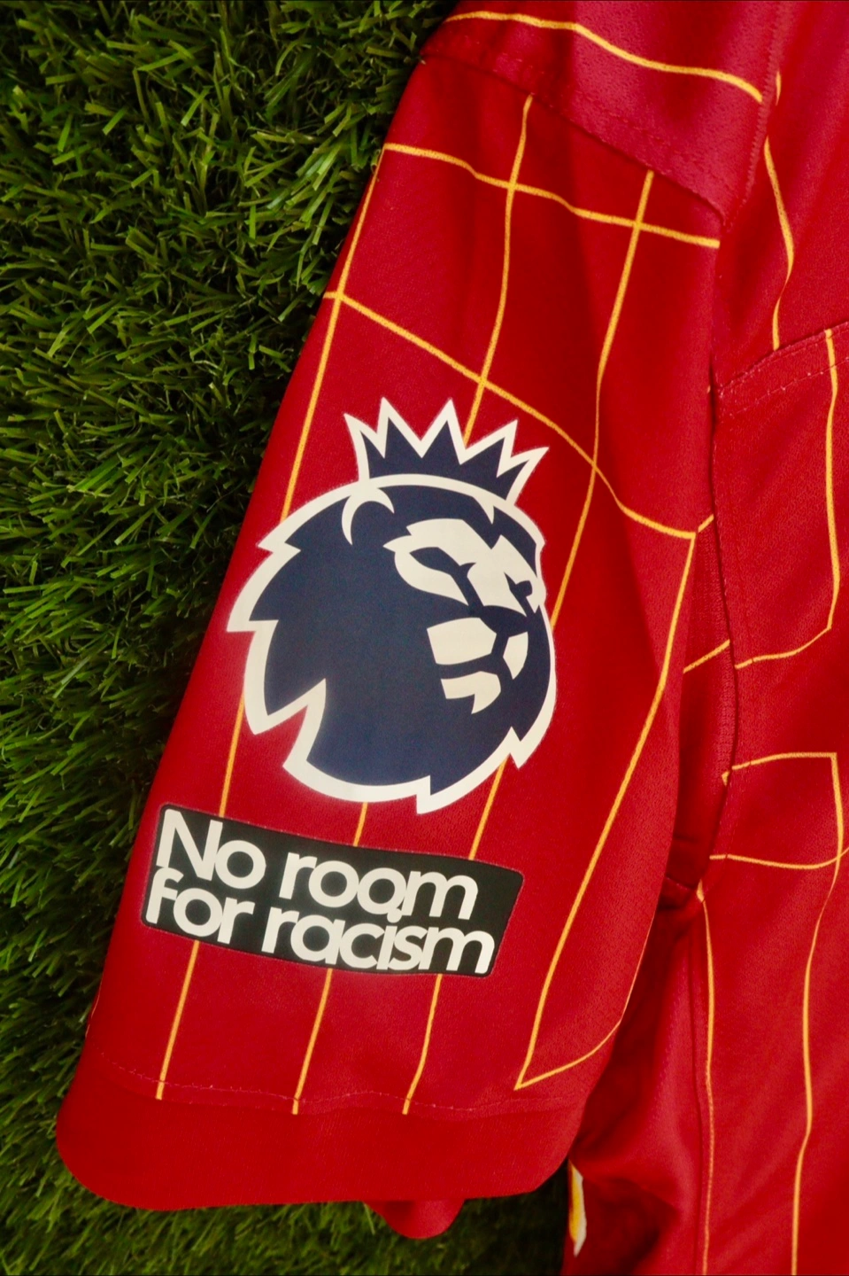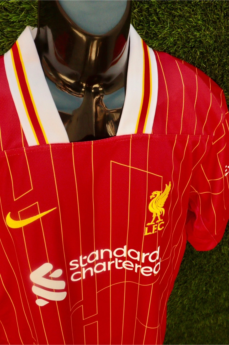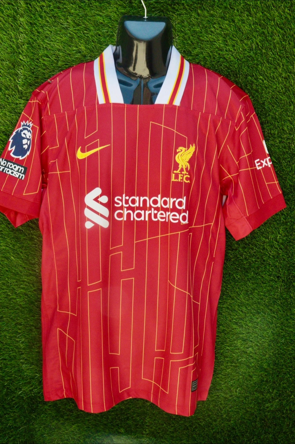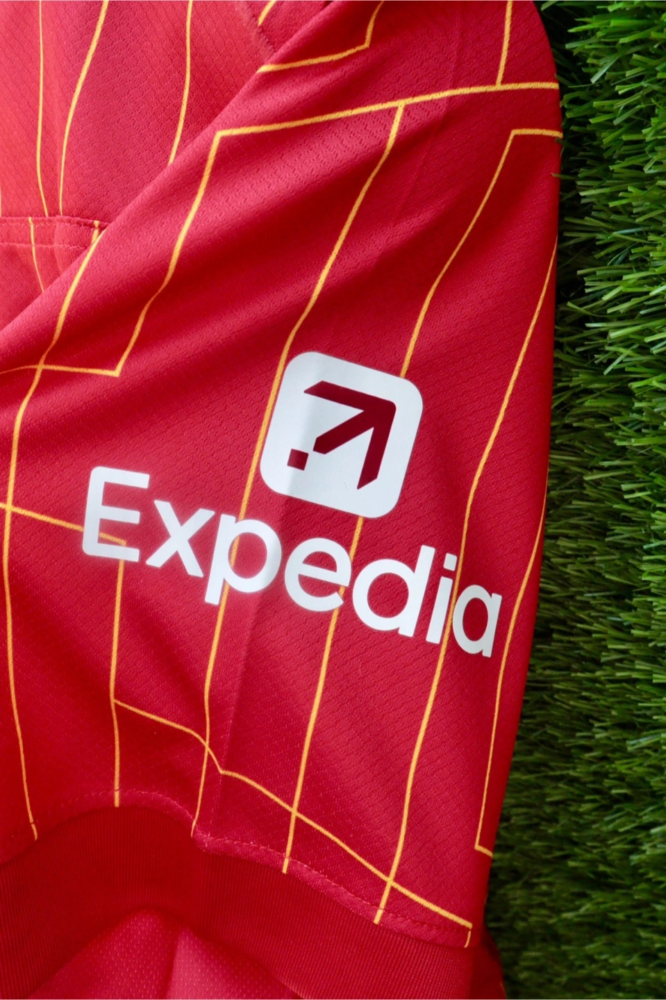 Selling a Liverpool FC jersey with M. Salah and the number 11 on the back. It features the Standard Chartered logo on the front and the Expedia logo on the sleeve. Perfect for any Liverpool fan!