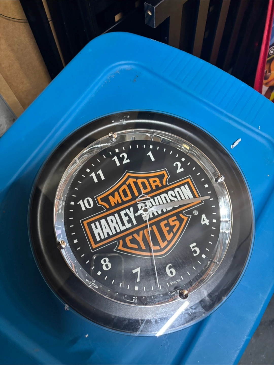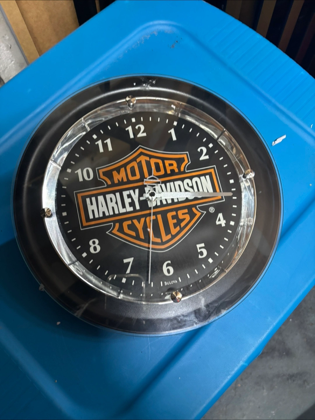 Here's a Harley-Davidson Cycles wall clock made by Bulova. It features a black face with the Harley-Davidson logo and easy-to-read numbers. A great addition for any Harley enthusiast's space!
