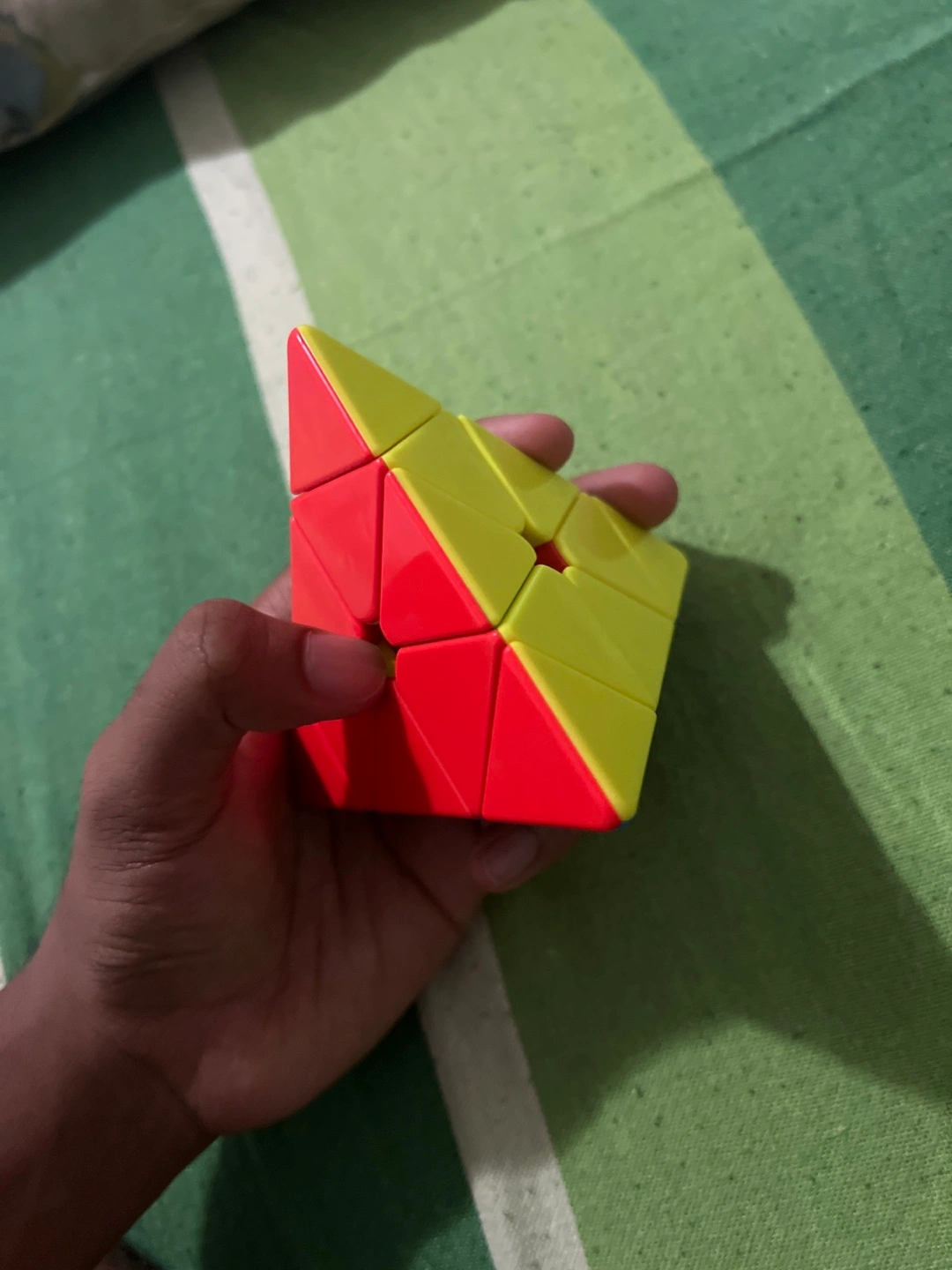 Selling a pyraminx cube puzzle! It's a fun twist on the classic Rubik's cube and a great brain teaser. The colours are vibrant and it's in good condition Just have a bunch laying around, lemme know if you need any other kind of puzzles!
