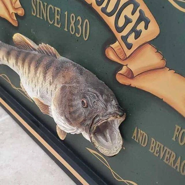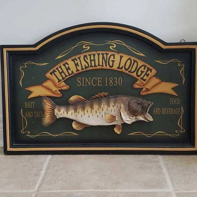 Add rustic charm and outdoor spirit to your space with this “The Fishing Lodge” 3D wall sign. Featuring a lifelike bass fish that extends from the plaque, this decorative piece is perfect for fishing enthusiasts, cabin owners, or anyone wanting a lodge-style atmosphere. The sign displays vintage-style gold lettering on a forest green background: The Fishing Lodge – Since 1830 – Bait and Tackle – Food and Beverage Framed in black with gold trim, it’s ready to hang with sturdy hooks on the back. Perfect For: Cabin, cottage, or fishing lodge décor Man cave or home bar wall art Restaurants, pubs, or bait shops Gifts for fishermen and outdoor lovers Details: 3D bass fish design Hanging hardware attached Approx. Size: 23.5" x 15.5". Pre-owned, excellent condition – see photos Fishing wall art, bass fish plaque, cabin lodge sign, rustic man cave décor, lake house wall art, 3D fish sign, vintage fishing lodge décor