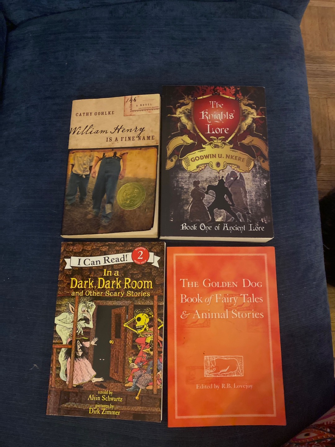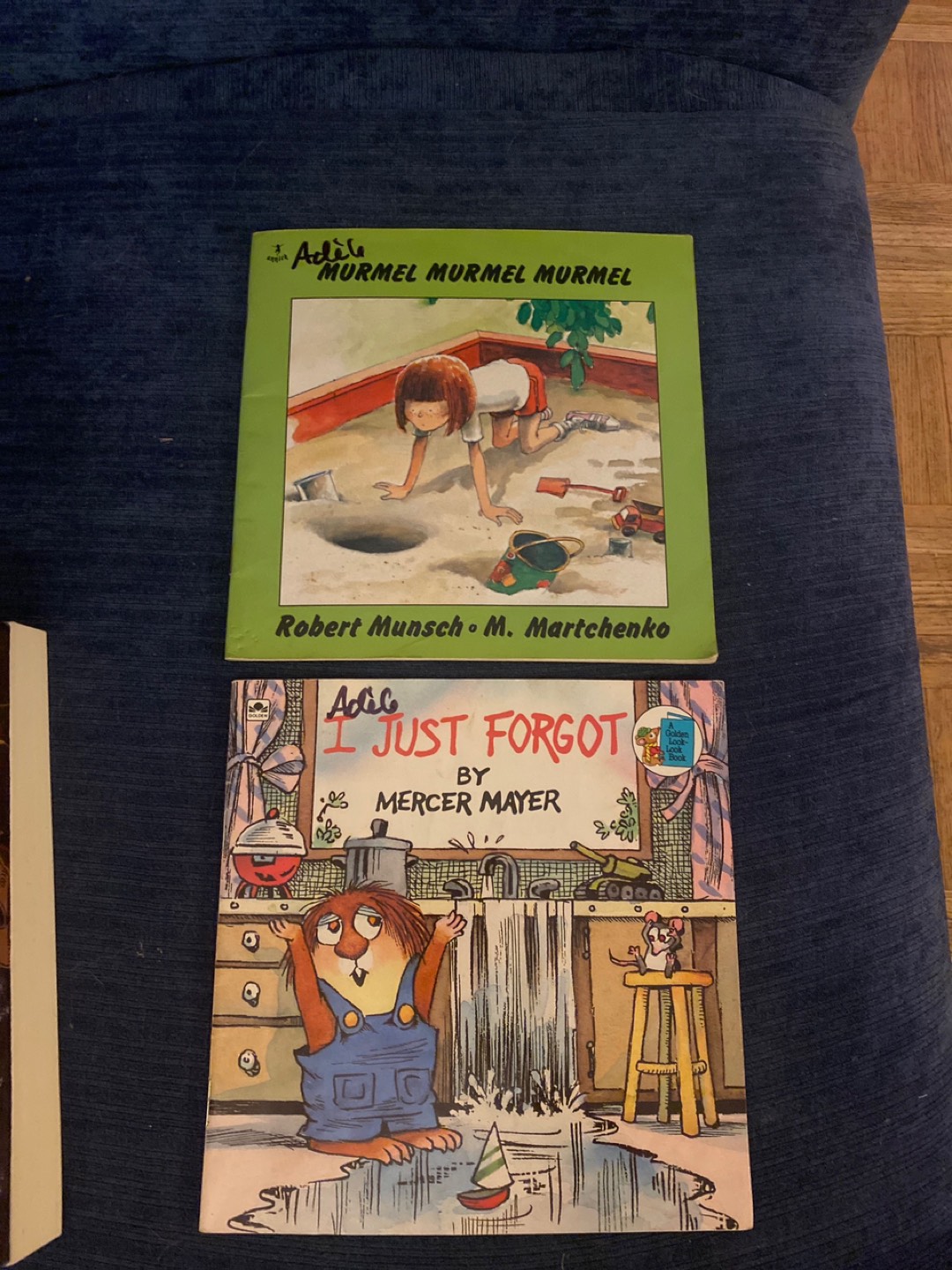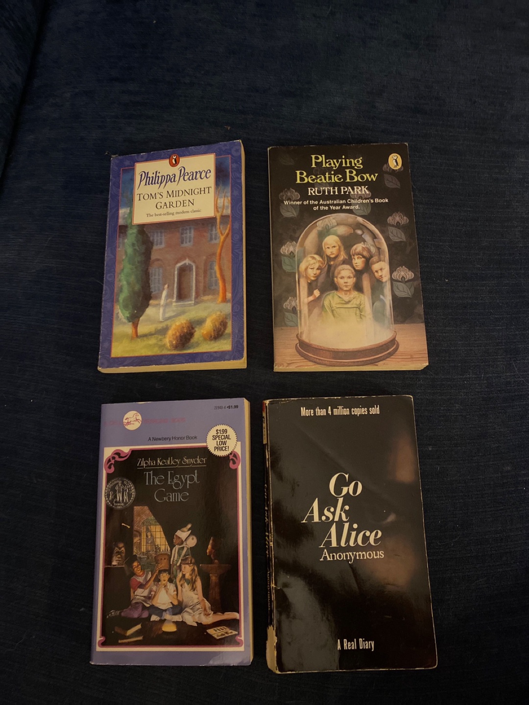 All for $85 $5 books: Go Ask Alice Playing Beatie Bow Tom’s Midnight Garden The Egypt Game Fairy Tales In a Dark, Dark, Room William Henry is a Fine Name The Knight’s Lore Go Dog Go There’s a Monster at the End of this Book Mortimer Paper Bag Princess Sing Along Ariel Murmel Murmel Murmel I just forgot The Reconstruction $10 Books The Last Unicorn Movies have Meaning Parenting Through Crisis