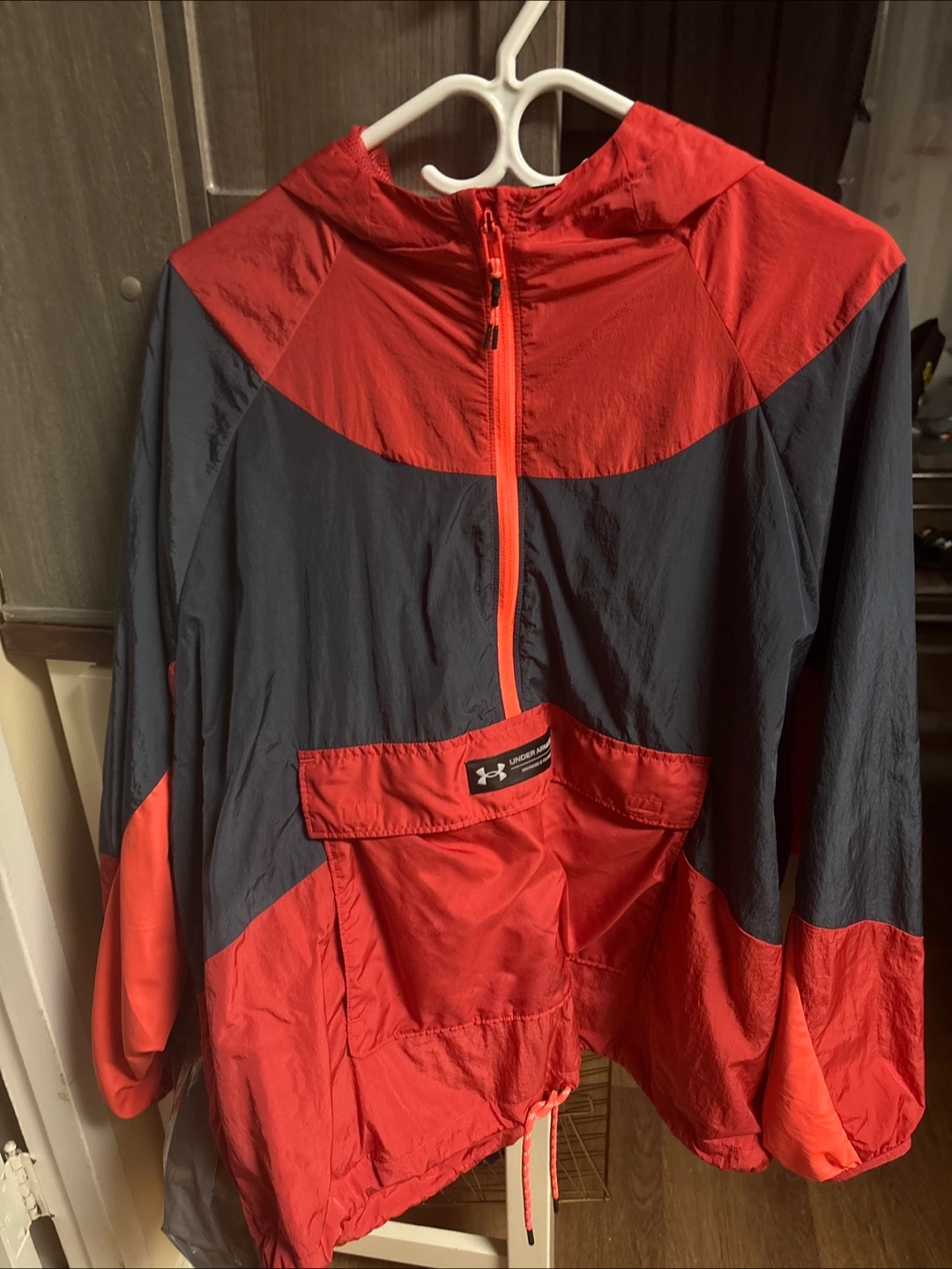 Here's a stylish Under Armour pullover jacket! It features a cool colour block design with red and grey panels. Perfect for layering or wearing on its own during cooler weather. Hood and front pouch pocket reg 260.w taxes only worn afew times