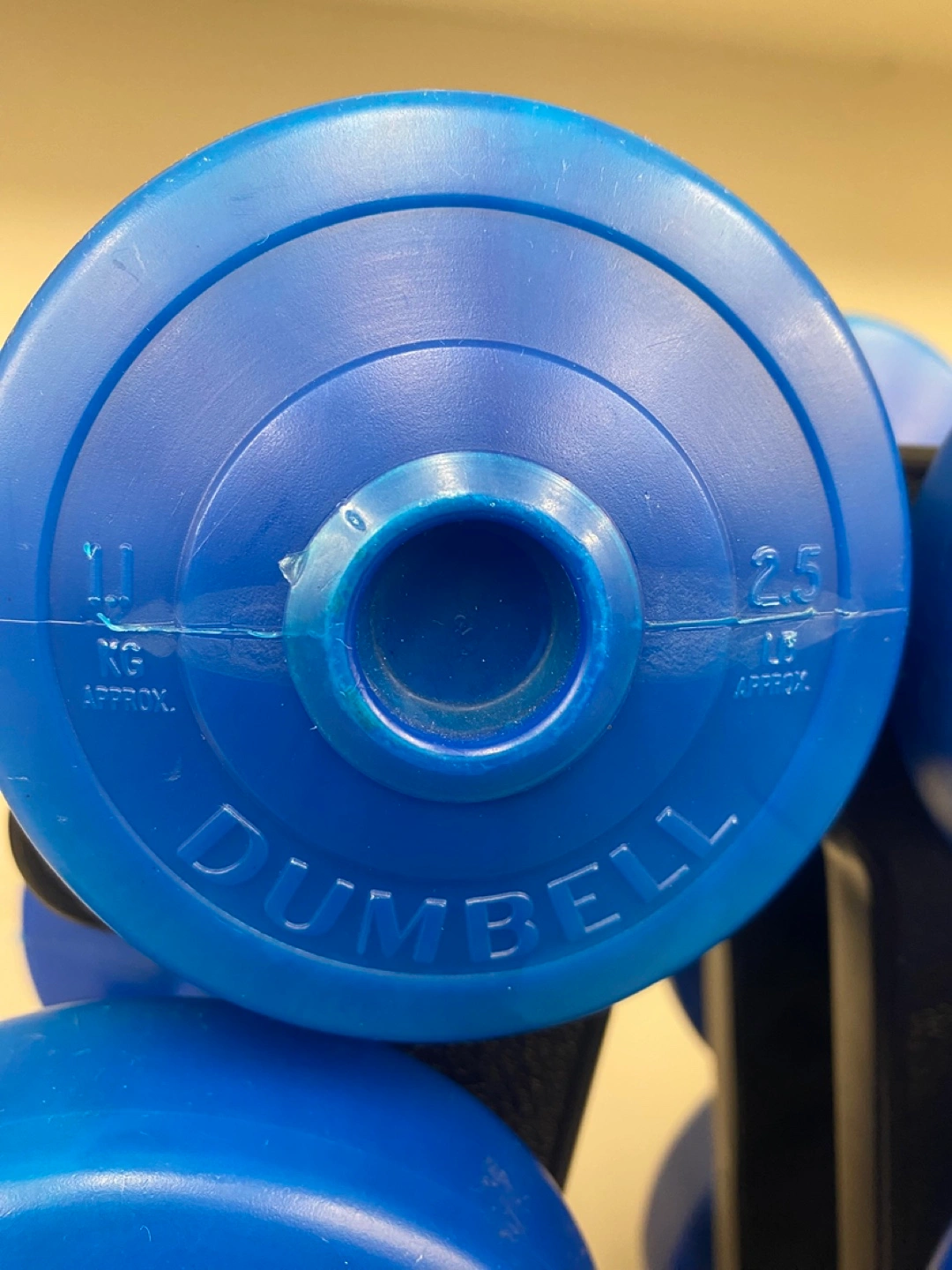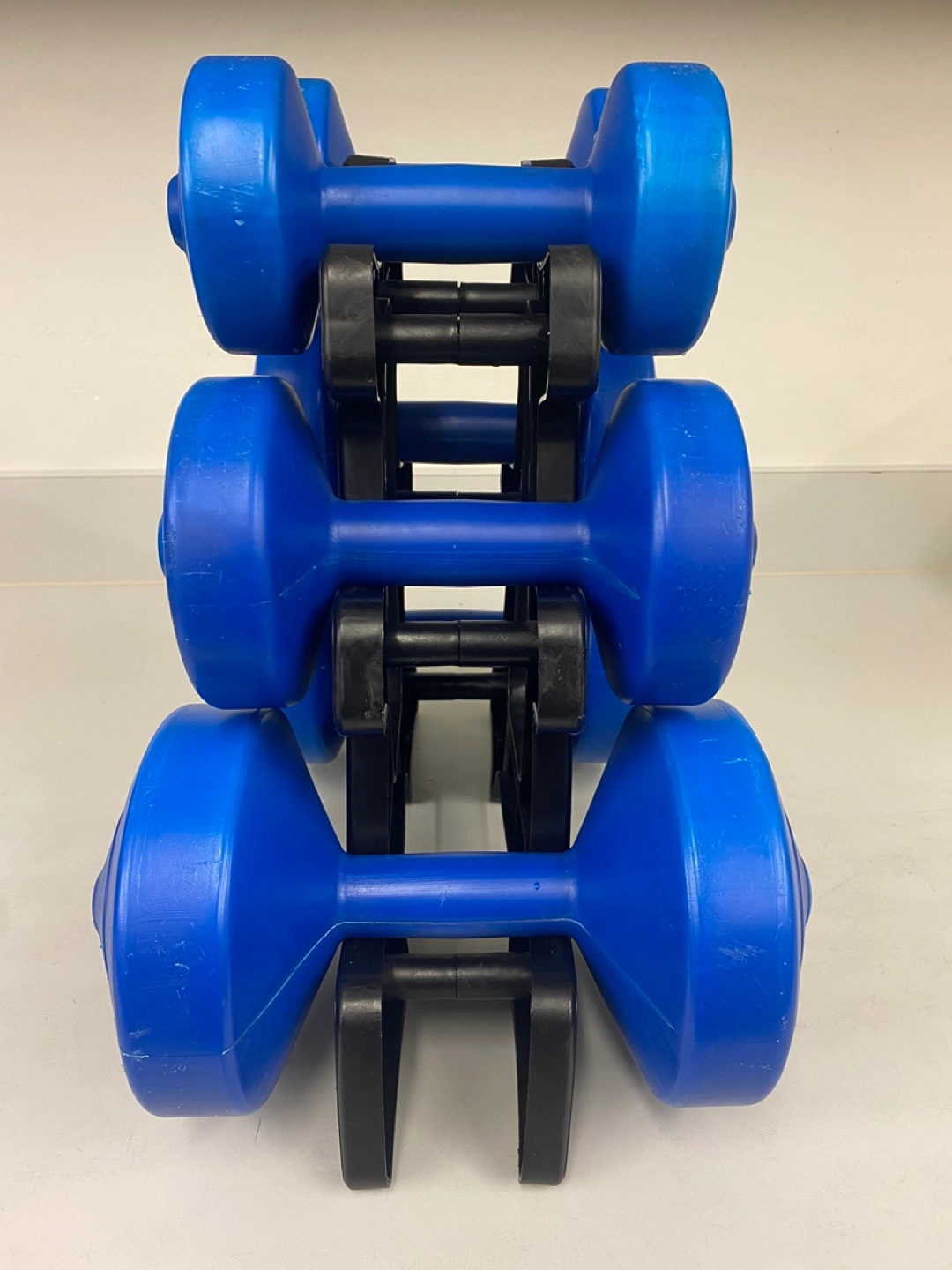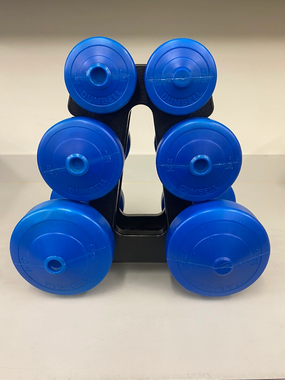 Selling a set of blue dumbbells with a rack! The weights range from 1.1 kg, 2.3 kg to 4.5 kg. Perfect for home workouts!