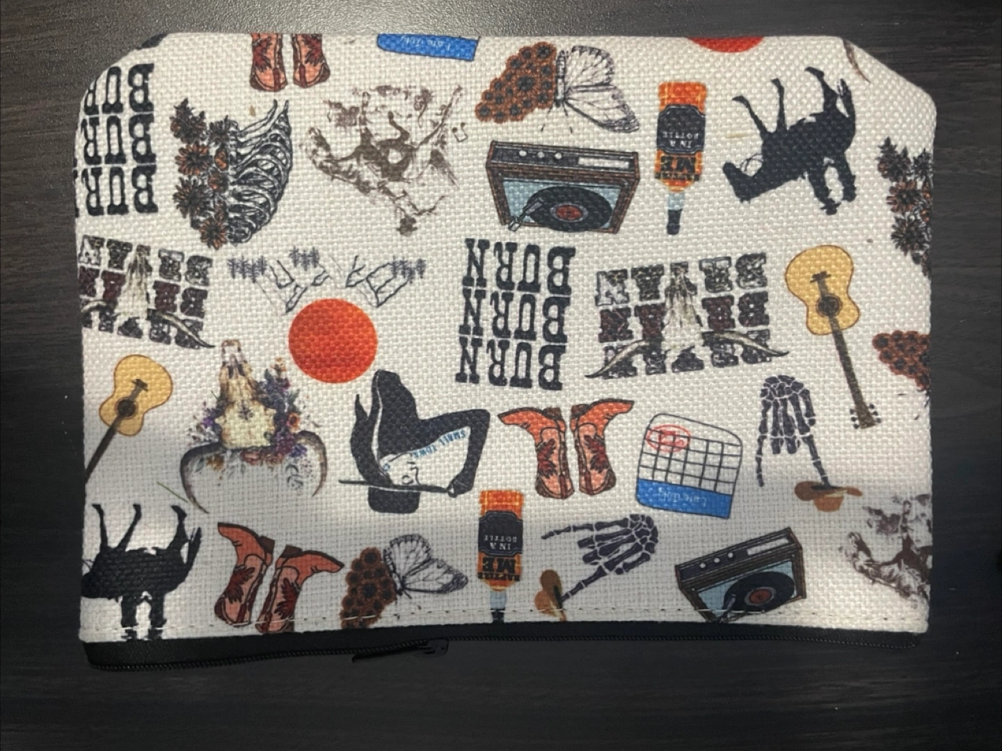 This cosmetic bag features a fun country music theme! It is approximately 10 inches wide and perfect for storing your makeup or other small items