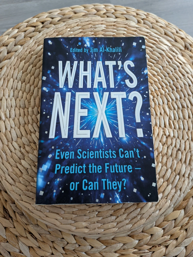 Selling the book 'What's Next?' edited by Jim Al-Khalili. The cover asks, 'Even Scientists Can't Predict the Future - or Can They?'