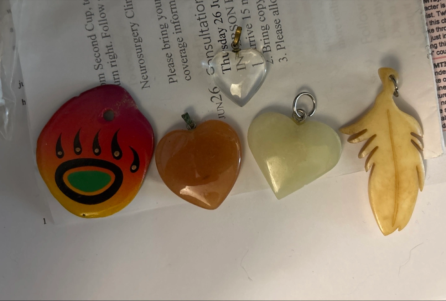 $5 for the whole collection of assorted pendants. There's a bear paw design with a gradient of red, orange and yellow, several heart-shaped pendants in different colours, and a feather pendant. They're perfect for adding a unique touch to your jewellery collection