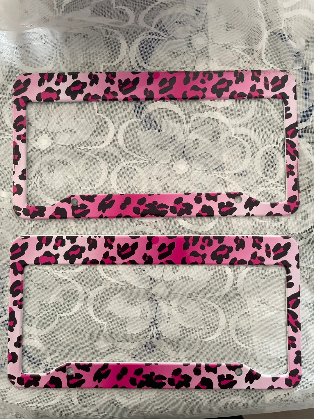 Two cute license plate frames with a pink and black leopard print! Add a fun touch to your ride with these easy-to-install frames
