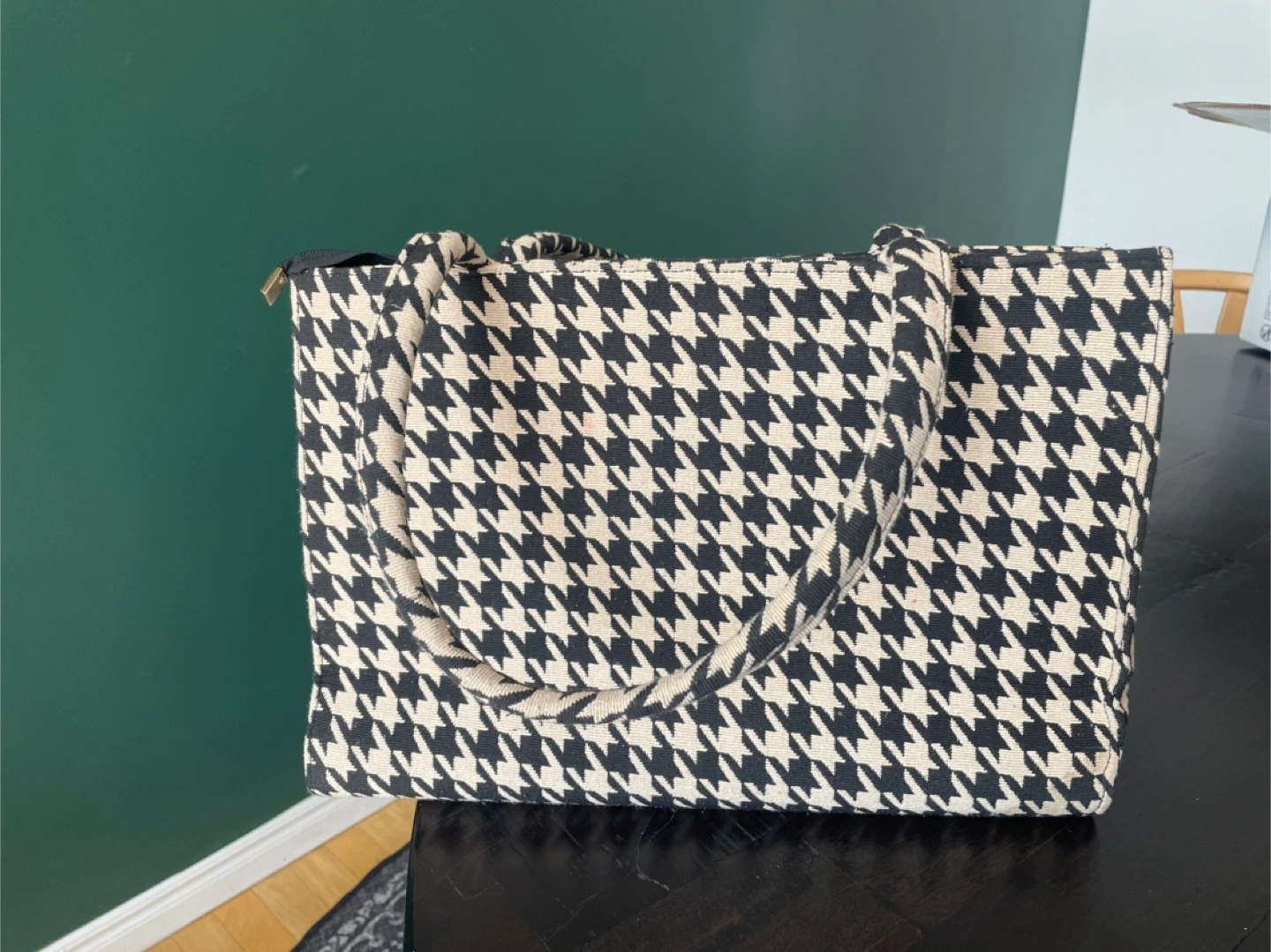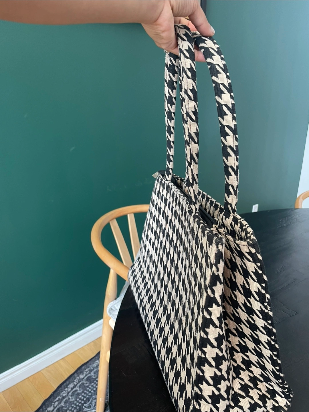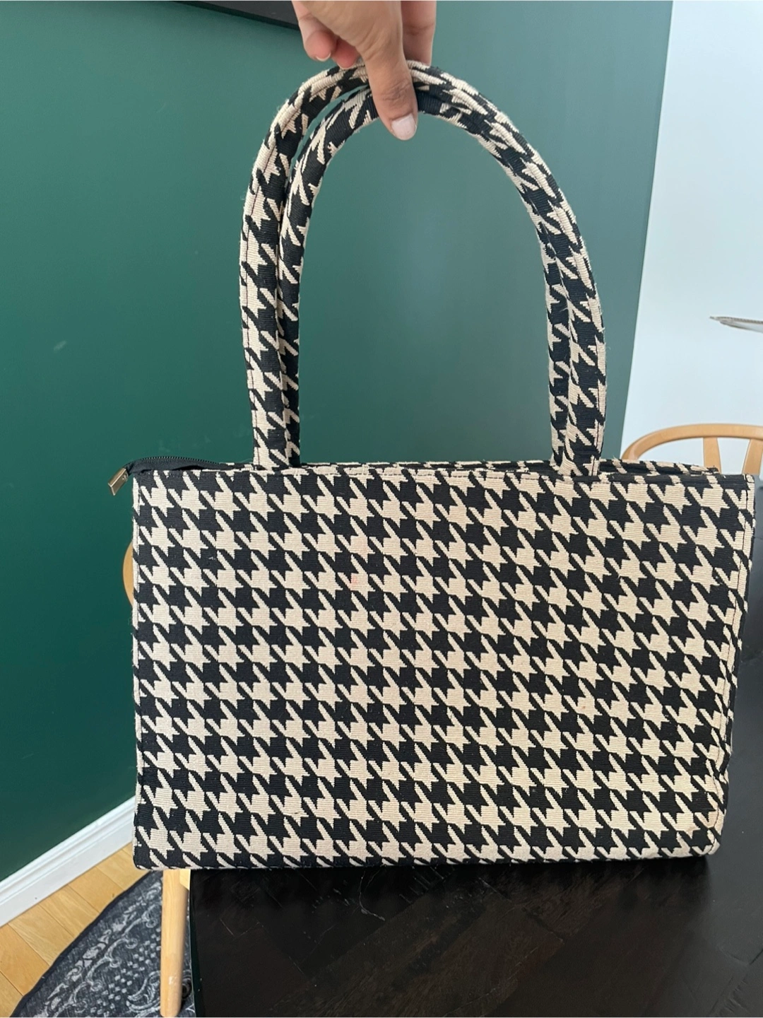 This is a stylish tote bag featuring a classic houndstooth pattern. It's perfect for carrying your everyday essentials. The bag has sturdy handles and a zippered closure to keep your belongings secure. It's in great condition. Dimensions- 15*10*6 inches