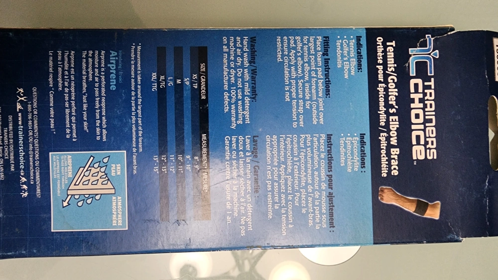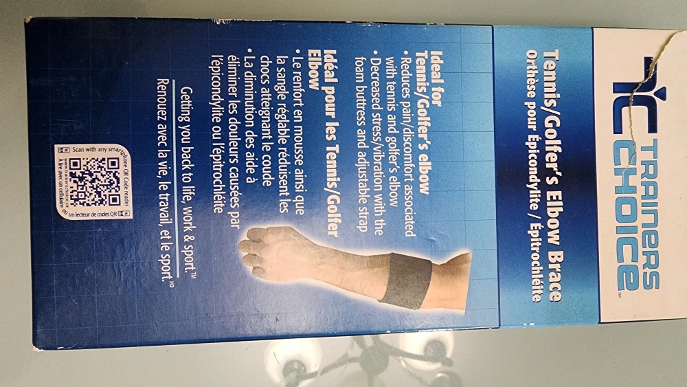 Selling a Trainer's Choice elbow brace. It's designed for tennis or golfer's elbow. The box includes fitting instructions.