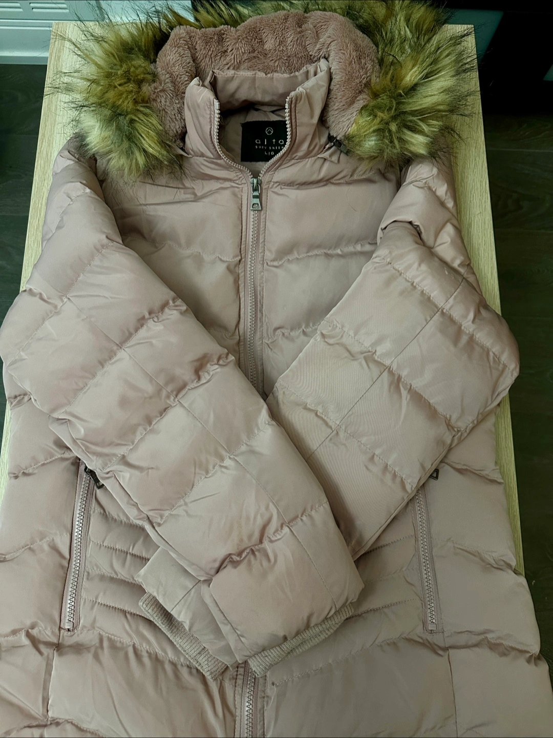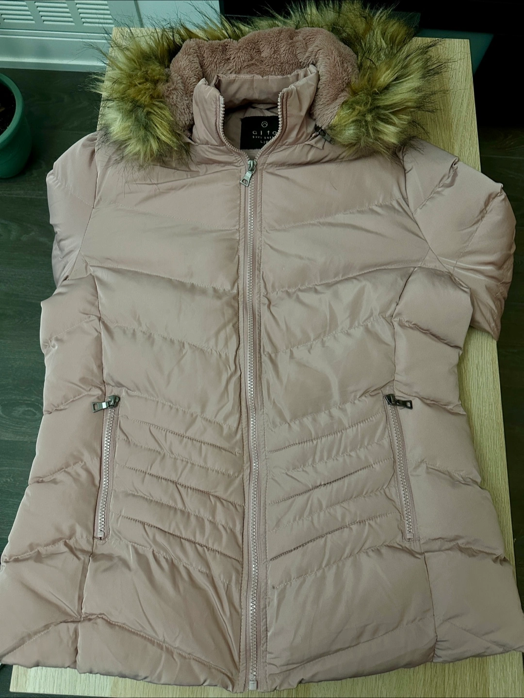 Cozy up in this puffer jacket! It's a lovely light pink colour and a size large. Perfect for staying warm on chilly days! Used only for one winter couple of times!