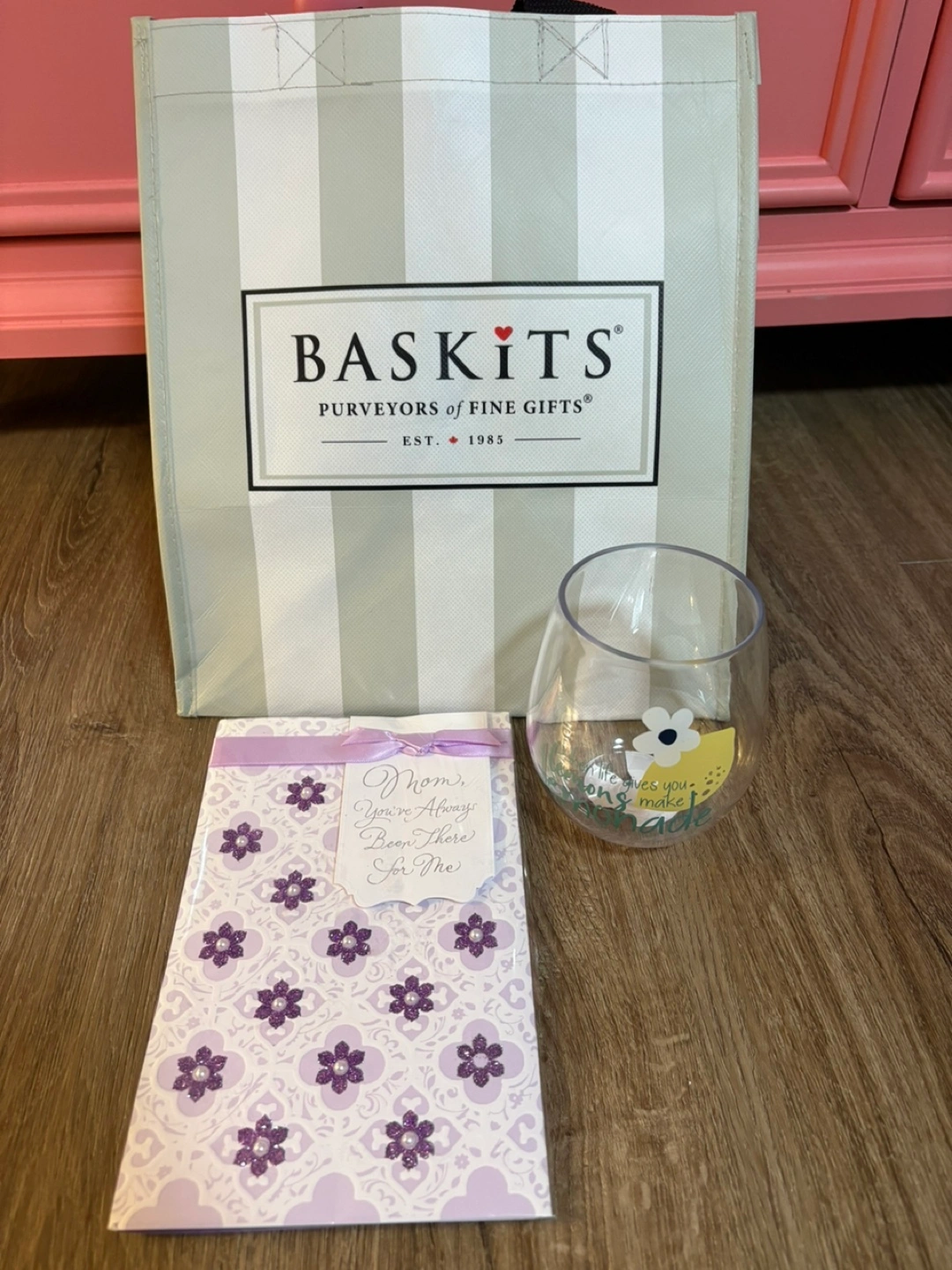 A lovely Baskits gift set! Includes a cute wine glass with a lemon design and a sweet card for Mom. Perfect for a thoughtful gift