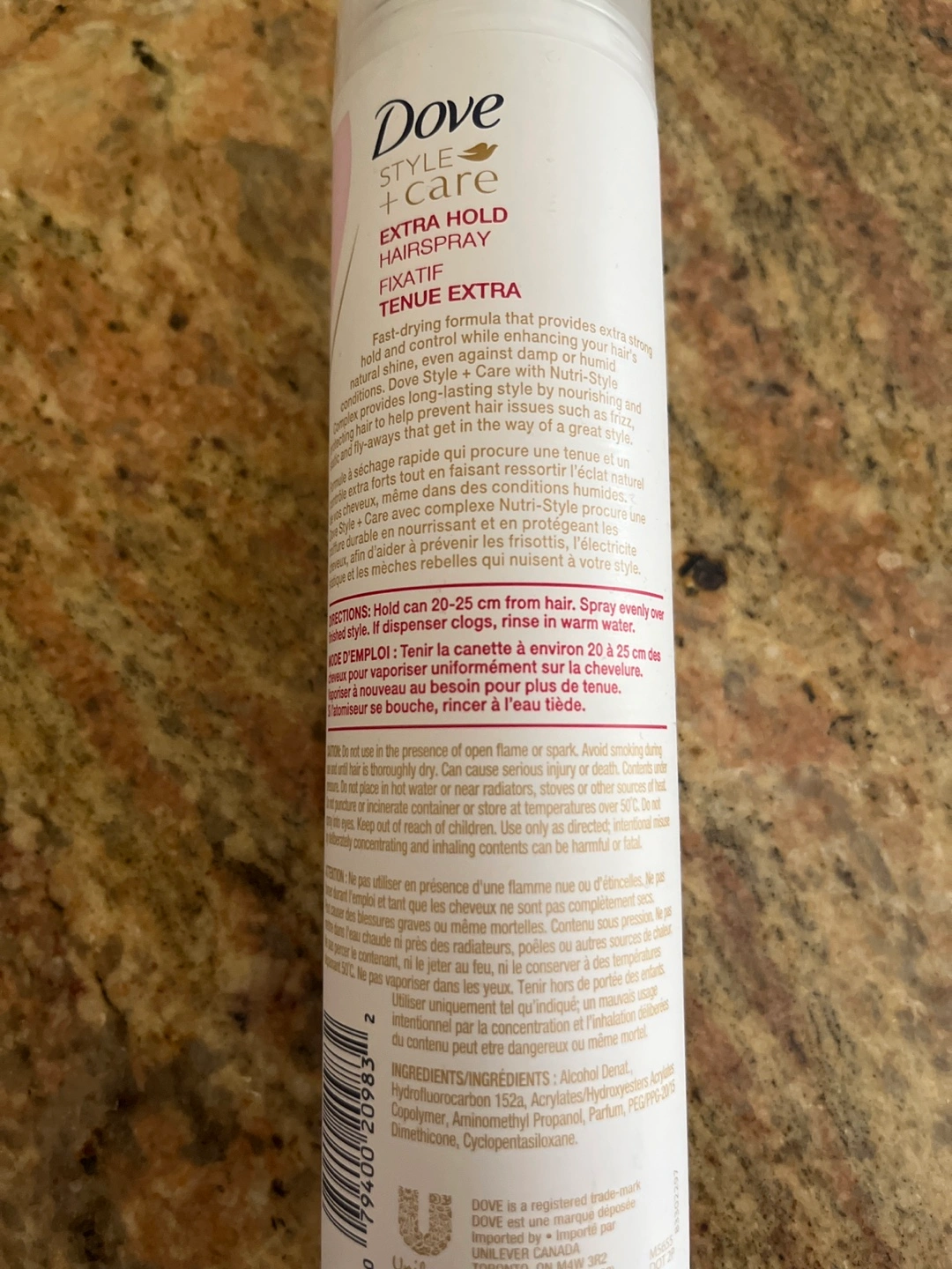 Selling a can of Dove Style + Care Extra Hold Hairspray. It provides extra strong hold and control while enhancing your hair's natural shine, even against damp or humid conditions. The formula is fast-drying and provides a lasting style with Nutri-Style complex to help prevent hair issues such as frizz, fly-aways, and unruly hair