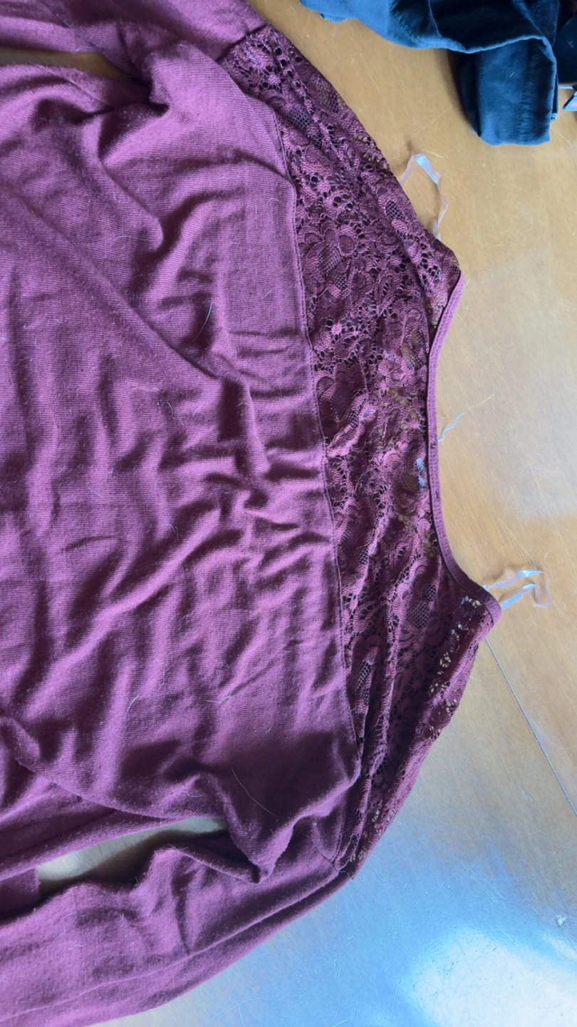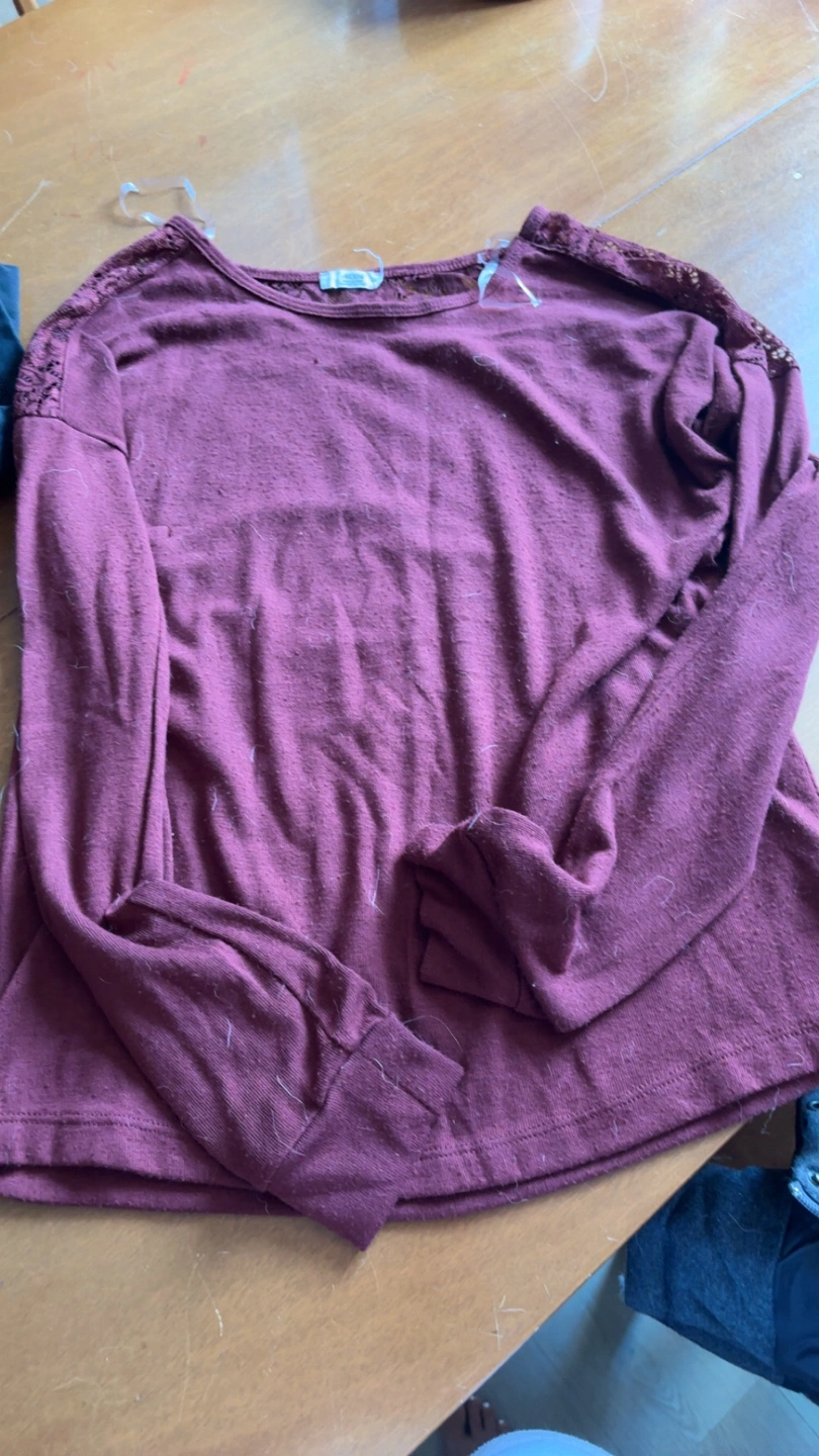 A lovely burgundy long-sleeved top with delicate lace detailing on the shoulders and upper back. It's in great condition and would be a stylish addition to any wardrobe! The material is soft and comfortable, perfect for layering or wearing on its own