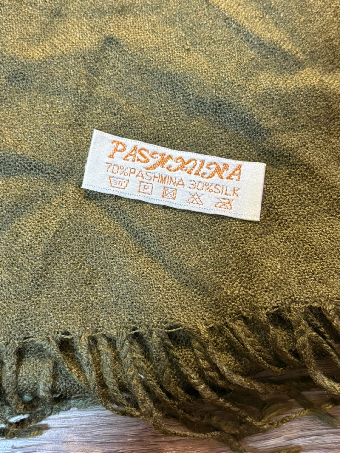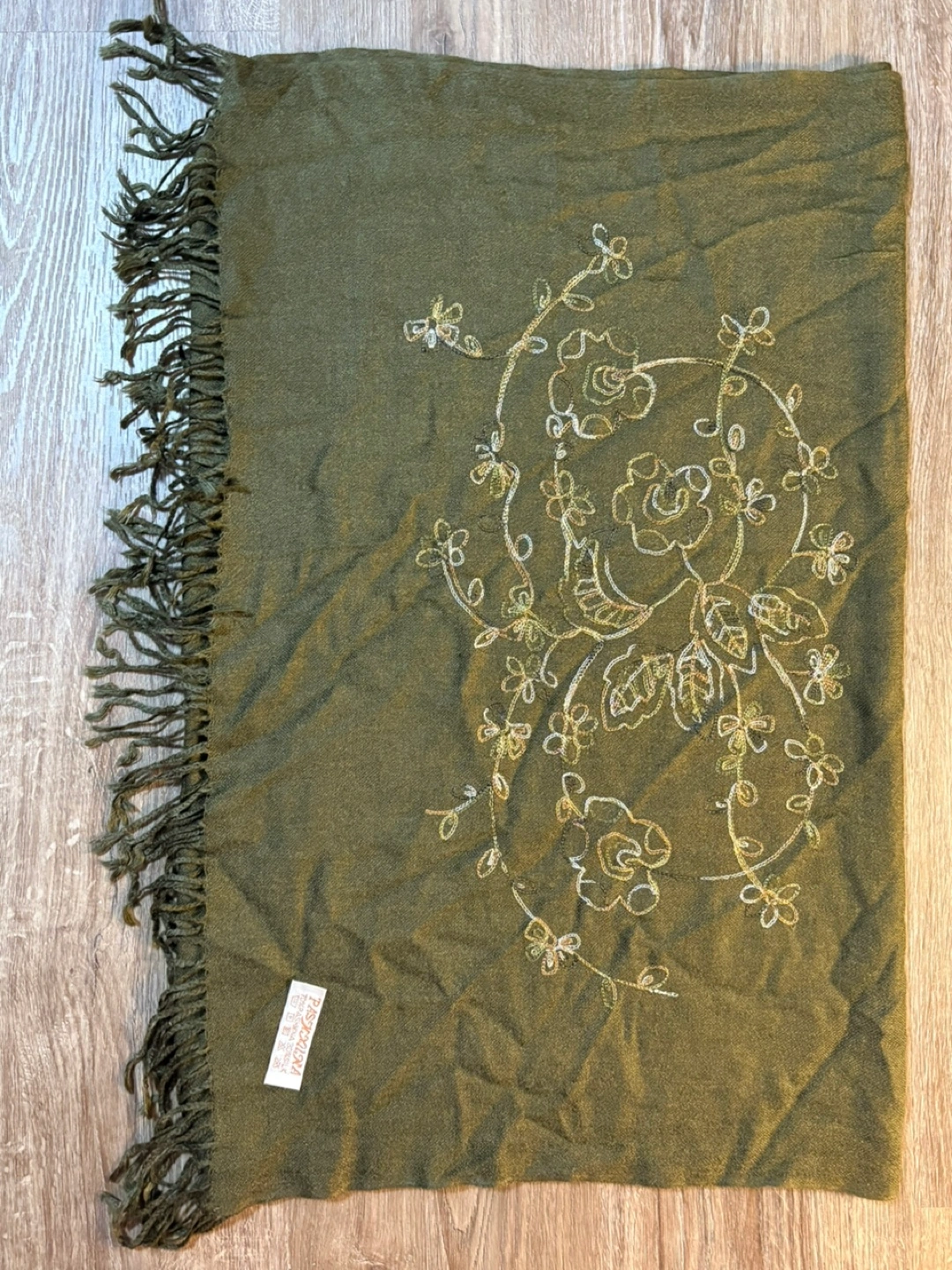 Cozy pashmina scarf in a lovely olive green colour! It's made of 70% pashmina and 30% silk, so it's super soft and warm. It also has a pretty floral design embroidered on it. Perfect for adding a touch of elegance to any outfit!