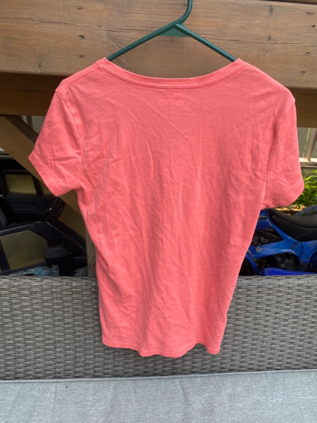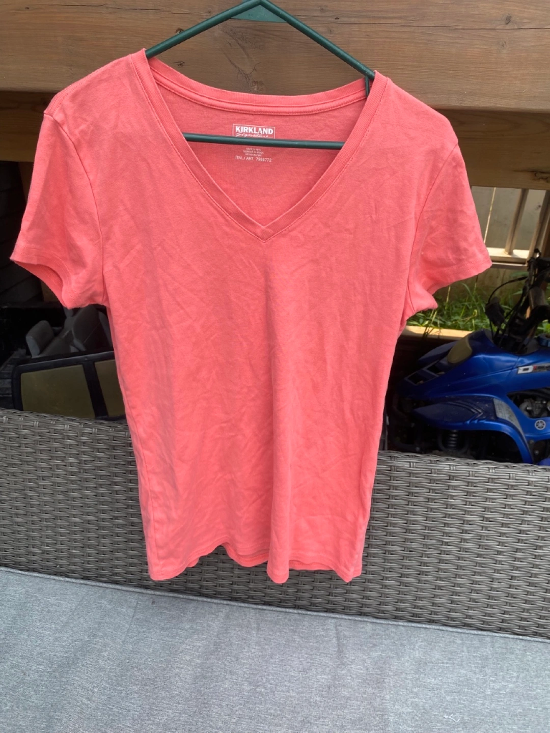 Open to negotiating prices. This is a Kirkland Signature ladies' V-neck t-shirt in size Large. It's a lovely coral colour and in great condition. Perfect for everyday wear!