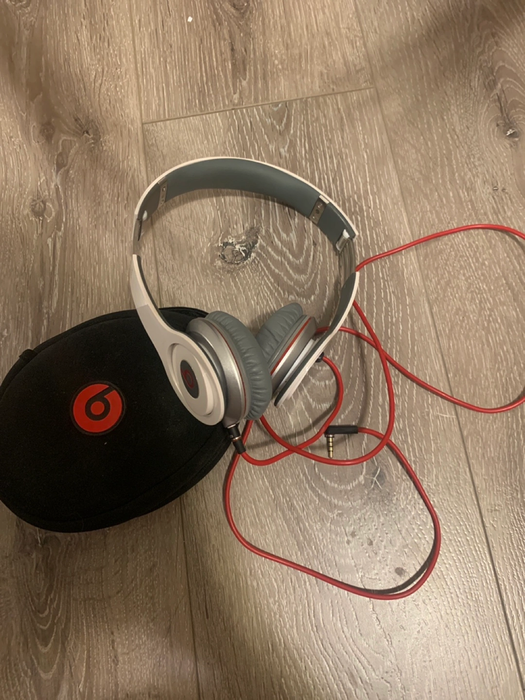 Selling a pair of Beats by Dr. Dre Solo HD headphones in white. These are in good condition and come with the carrying case. Great for listening to music on the go!