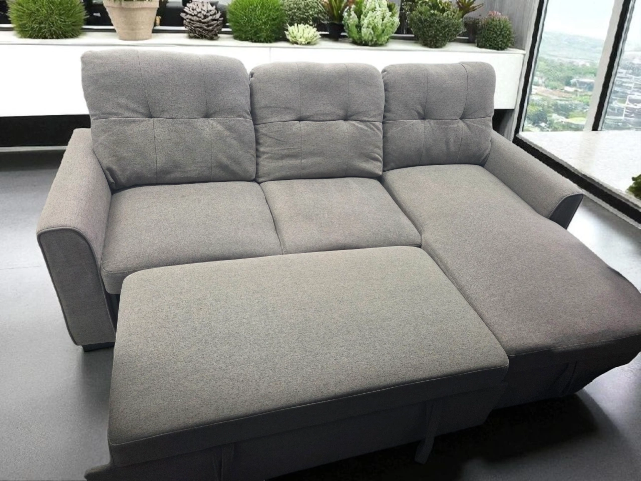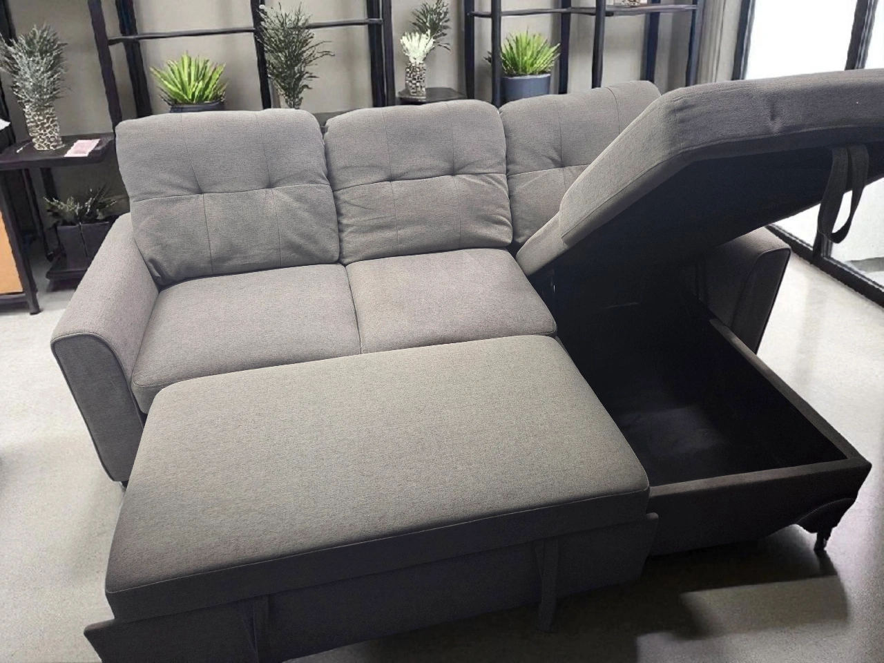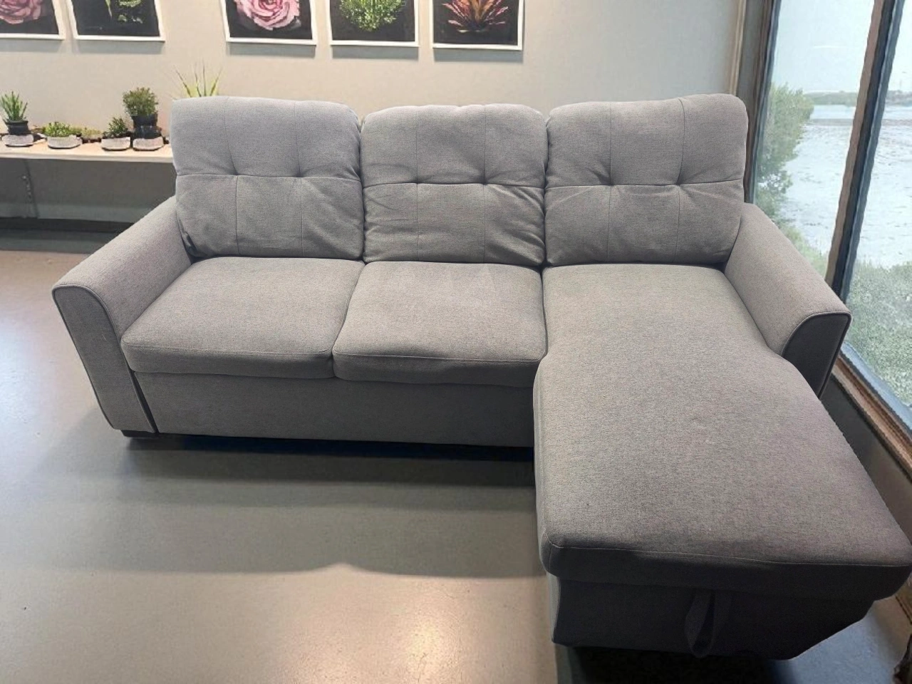 Upgrade your living room with this stylish and functional grey sectional sofa! Perfect for small spaces, condos, or family rooms, it offers both comfort and practicality. Features: Comfortable seating: Soft cushions with tufted backrest for extra support Reversible chaise: Can be placed on either side to suit your space Built-in storage: Hidden compartment under chaise for blankets, pillows, or other items Pull-out bed function: Easily converts into a sleeping area for guests Neutral grey fabric: Pairs well with any décor style Condition: Gently used, well maintained, and cleaned before sale. No rips, tears, or major stains. Dimensions: Approx. 87" (L) x 60" (W with chaise) Delivery available for a fee. We can also dispose of your old sofa for $80 📍 Pickup/Delivery: Pickup available. Delivery can be arranged for a fee.