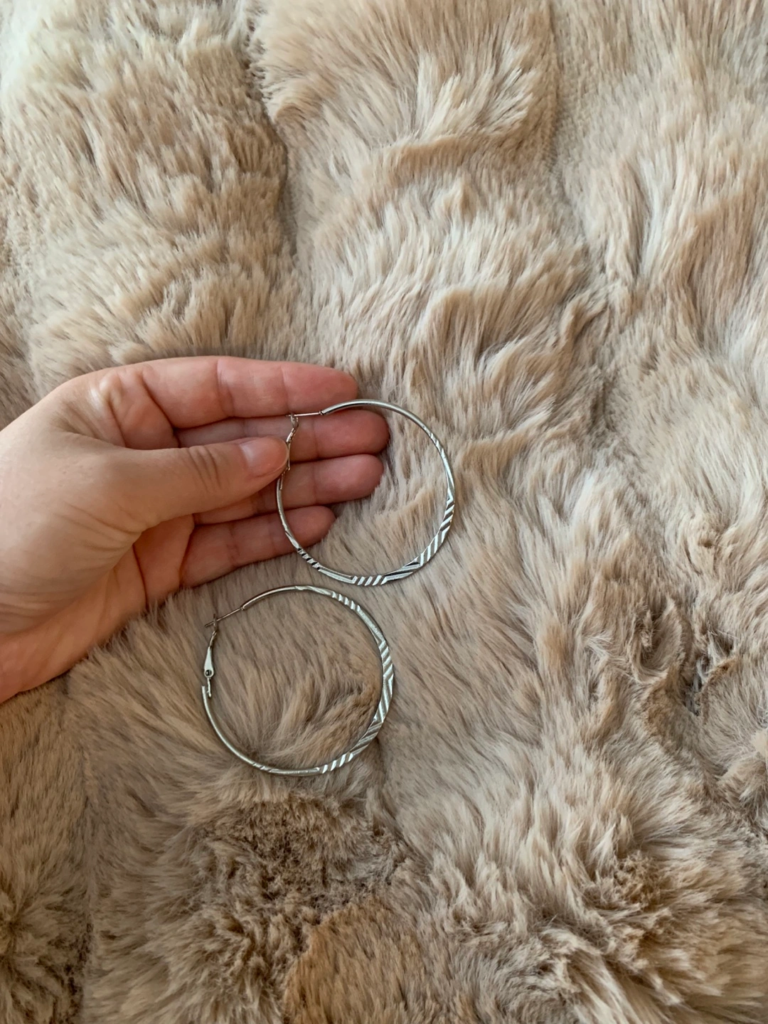 Selling a pair of silver hoop earrings. They have a nice textured design on them. Perfect for adding a little something extra to any outfit!