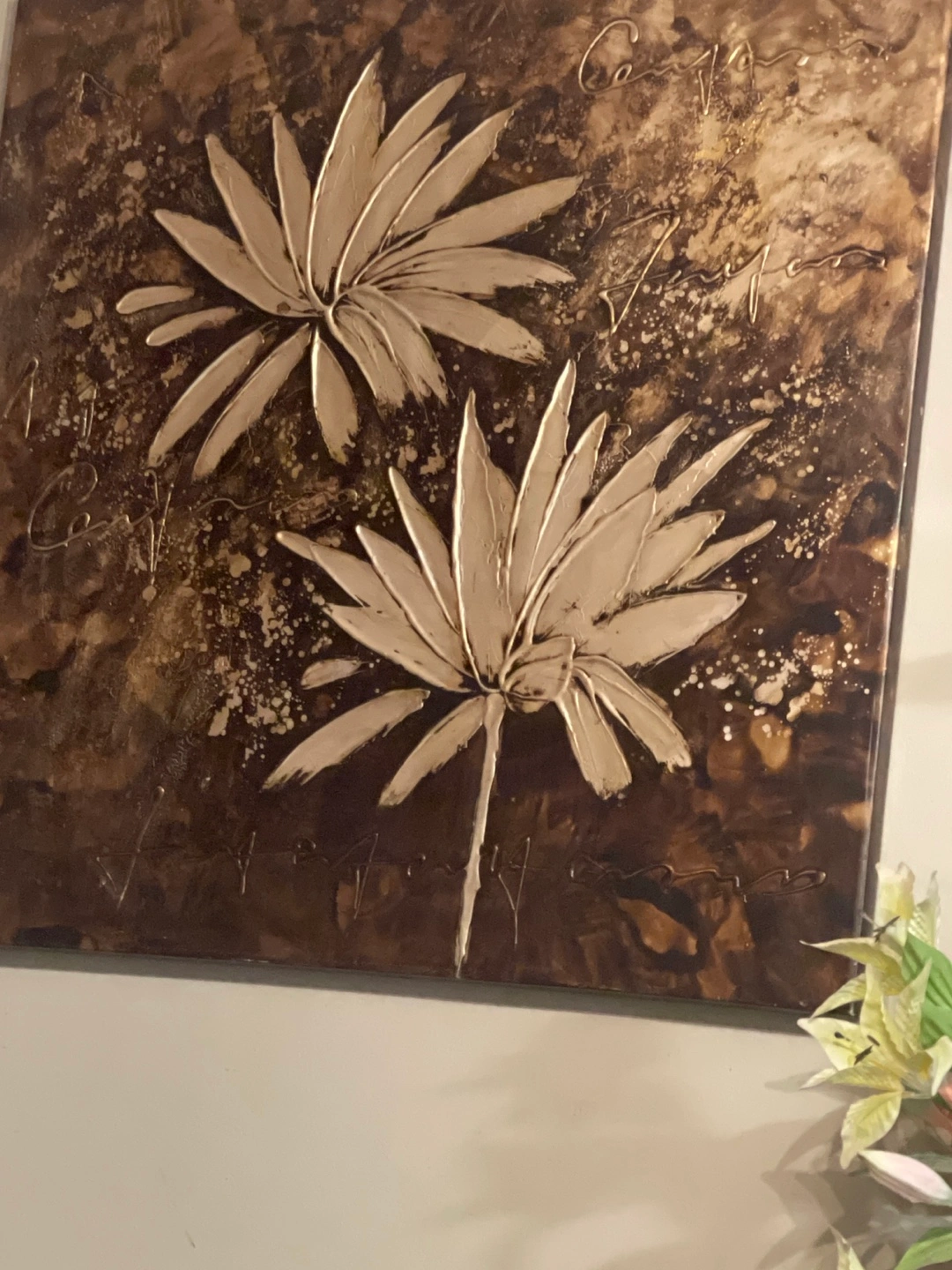 A beautiful piece of floral wall art, perfect for adding a touch of elegance to any room! The artwork features raised, textured flowers against a dark brown and gold background. It's in great condition and ready to hang