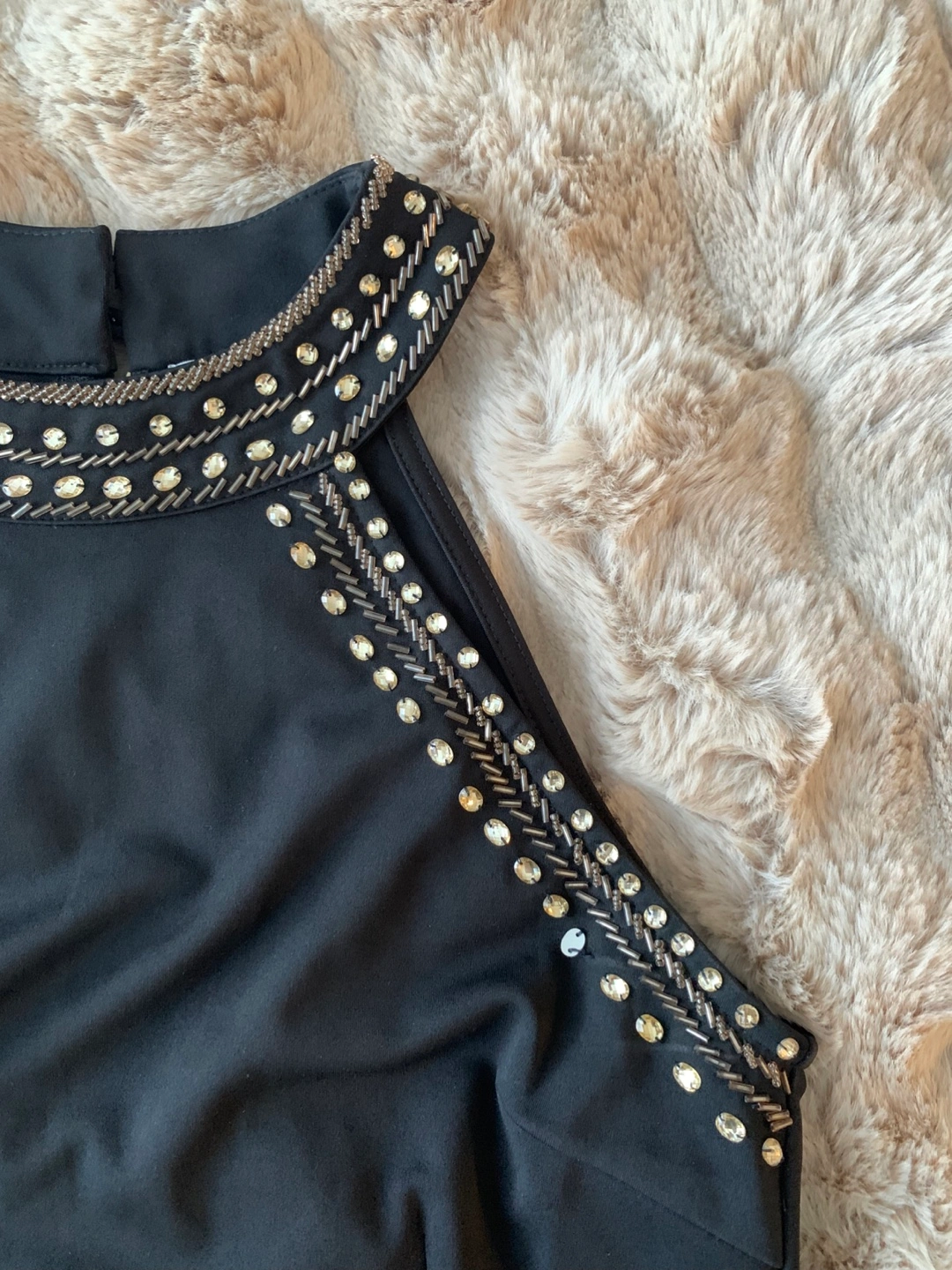 Selling a stylish black dress featuring unique embellishments around the neckline and arm openings. The material is 90% polyester and 10% elastane, offering a comfortable and flattering fit. It's perfect for a night out or a special occasion!