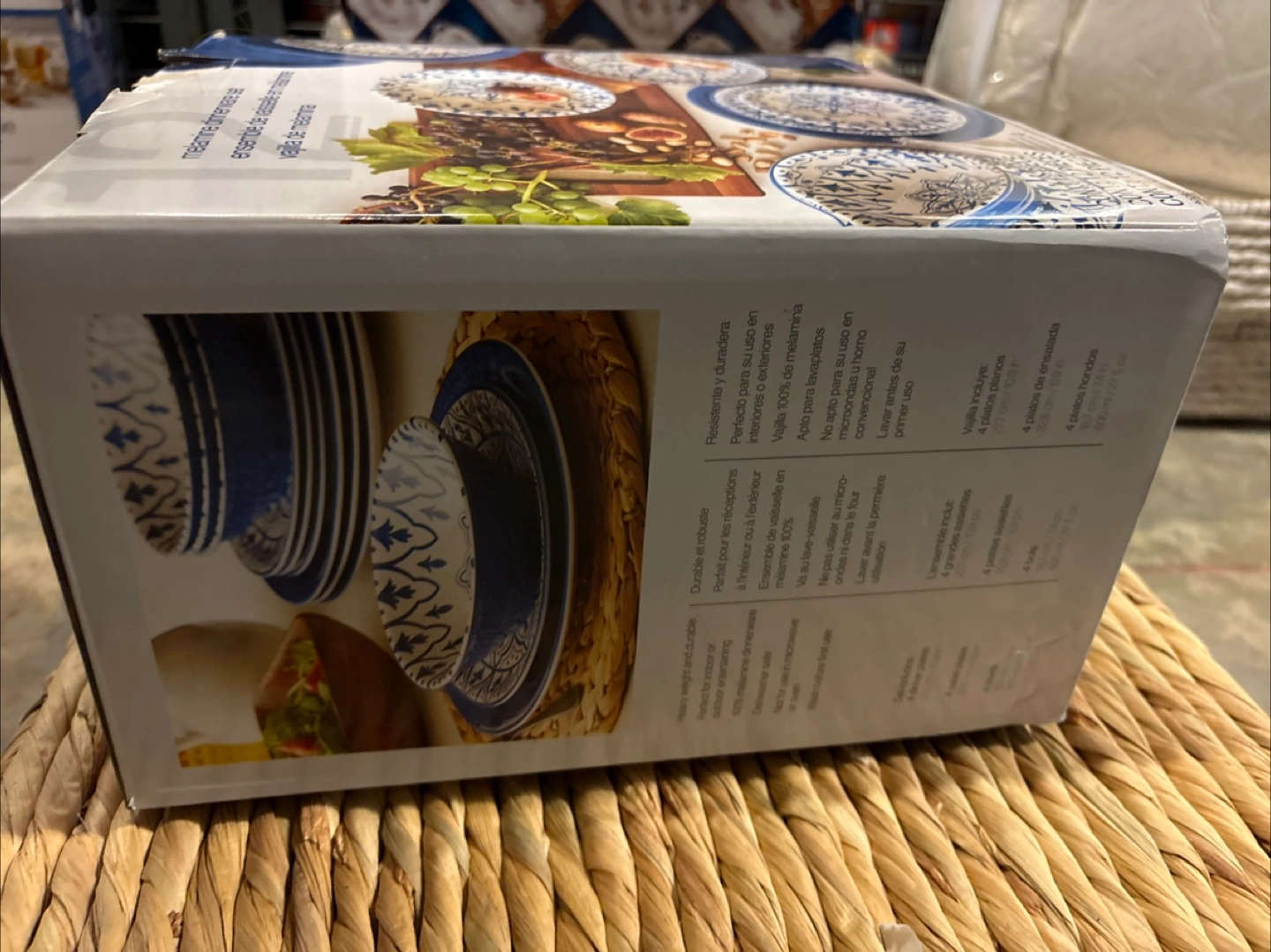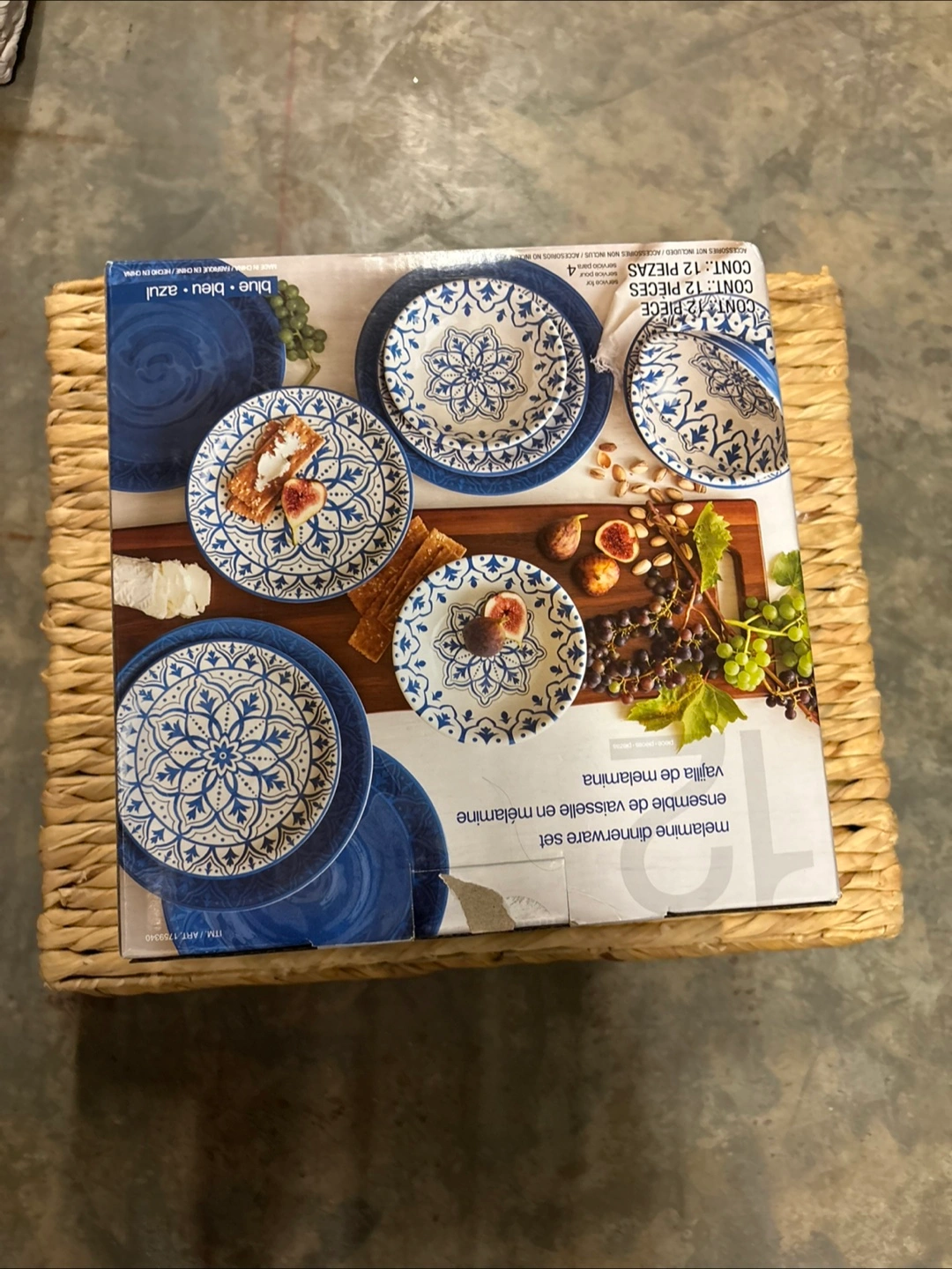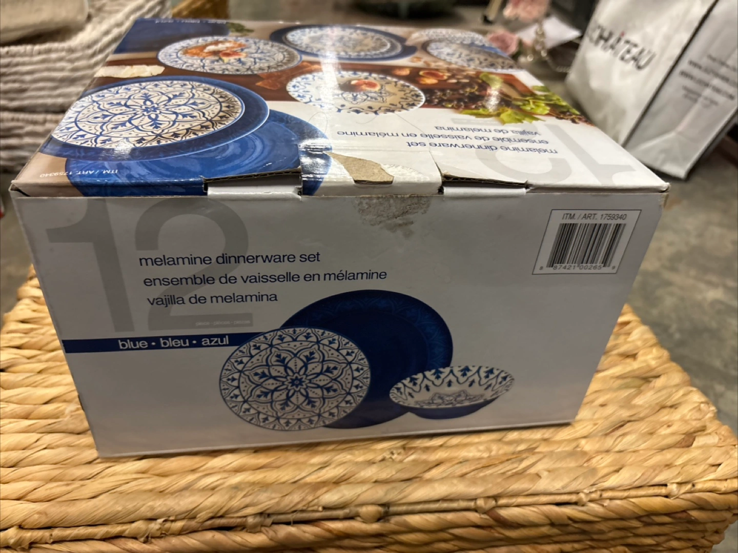 Selling a 12-piece melamine dinnerware set in blue! It's a durable and stylish ensemble perfect for indoor or outdoor entertaining. The set includes plates and bowls, and it's brand new in the box