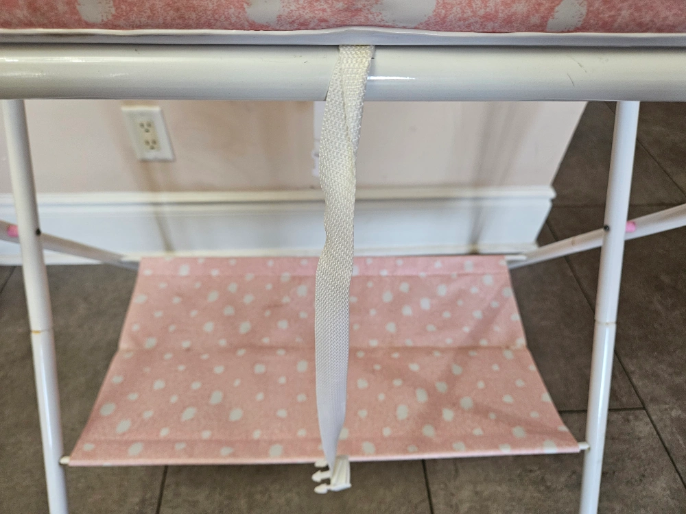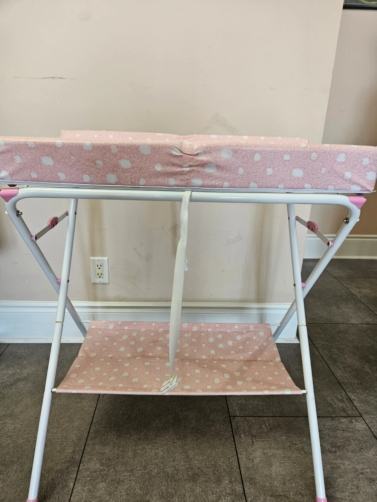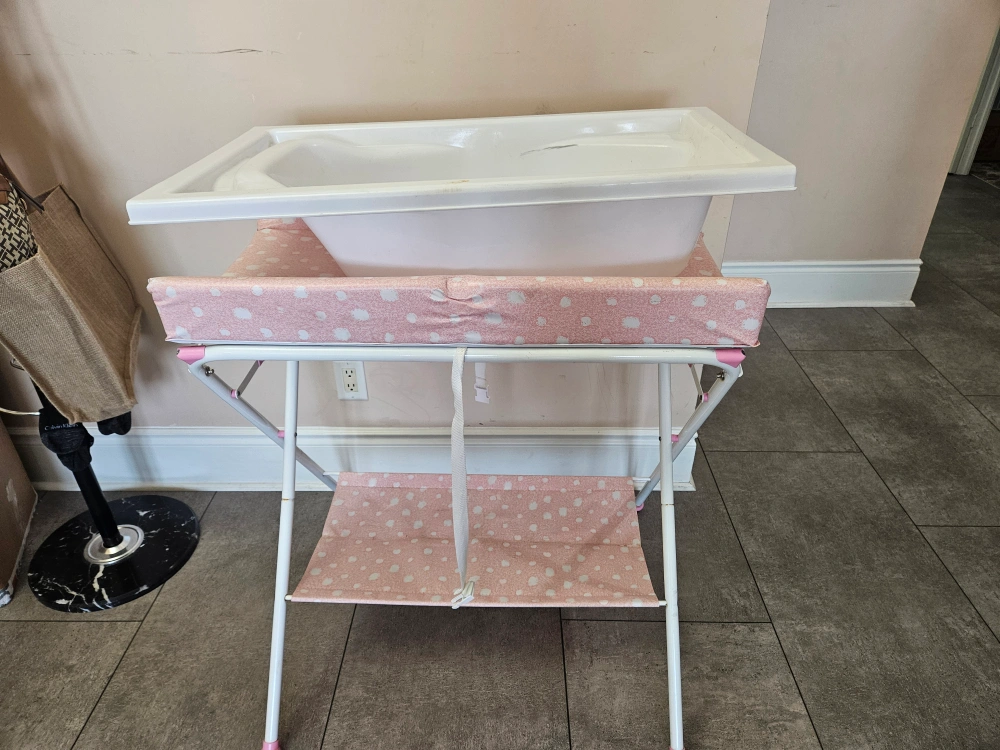 Selling a baby changing table that comes with a tub! It's in great condition and ready for a new home. The changing pad has a cute pink and white polka dot pattern. Perfect for keeping everything organized during diaper changes and bath time