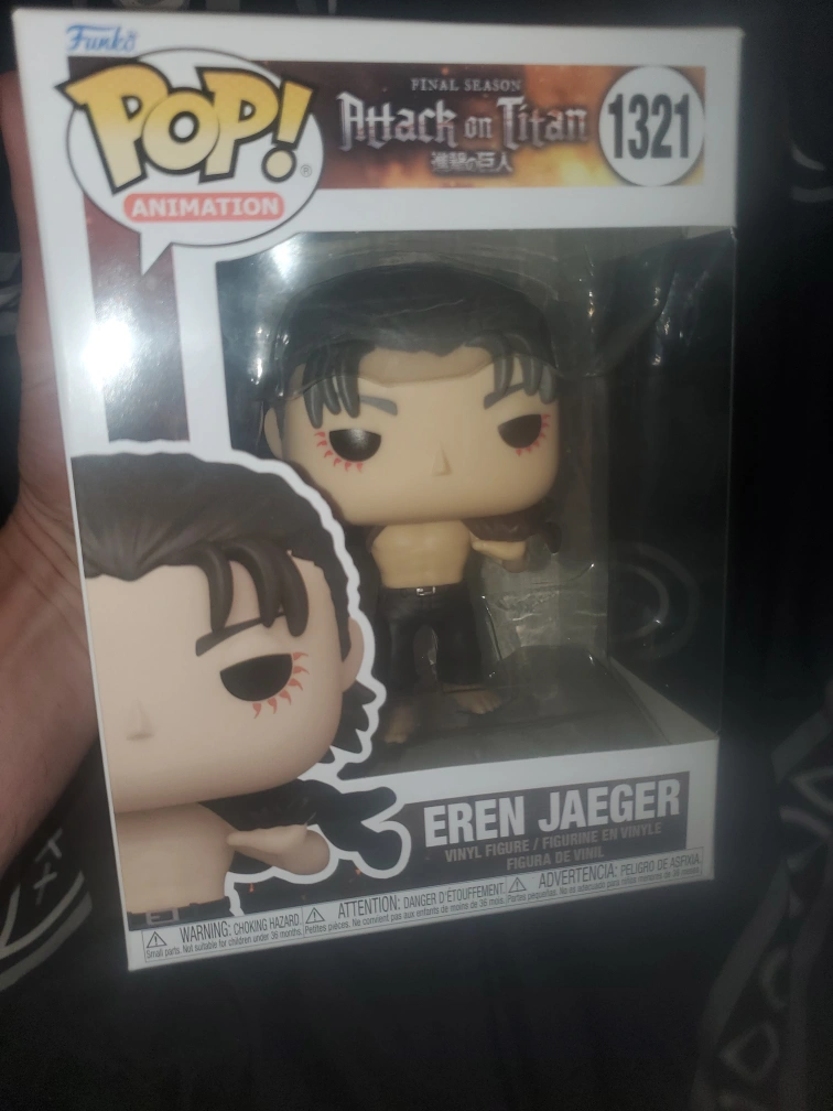 Selling a Funko Pop! figure of Eren Jaeger from Attack on Titan, number 1321. It's in great condition and comes in its original box. Perfect for any fan of the series!