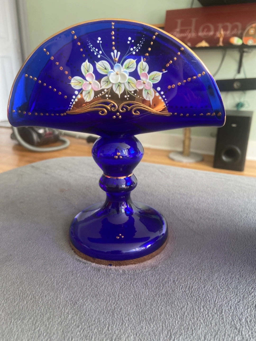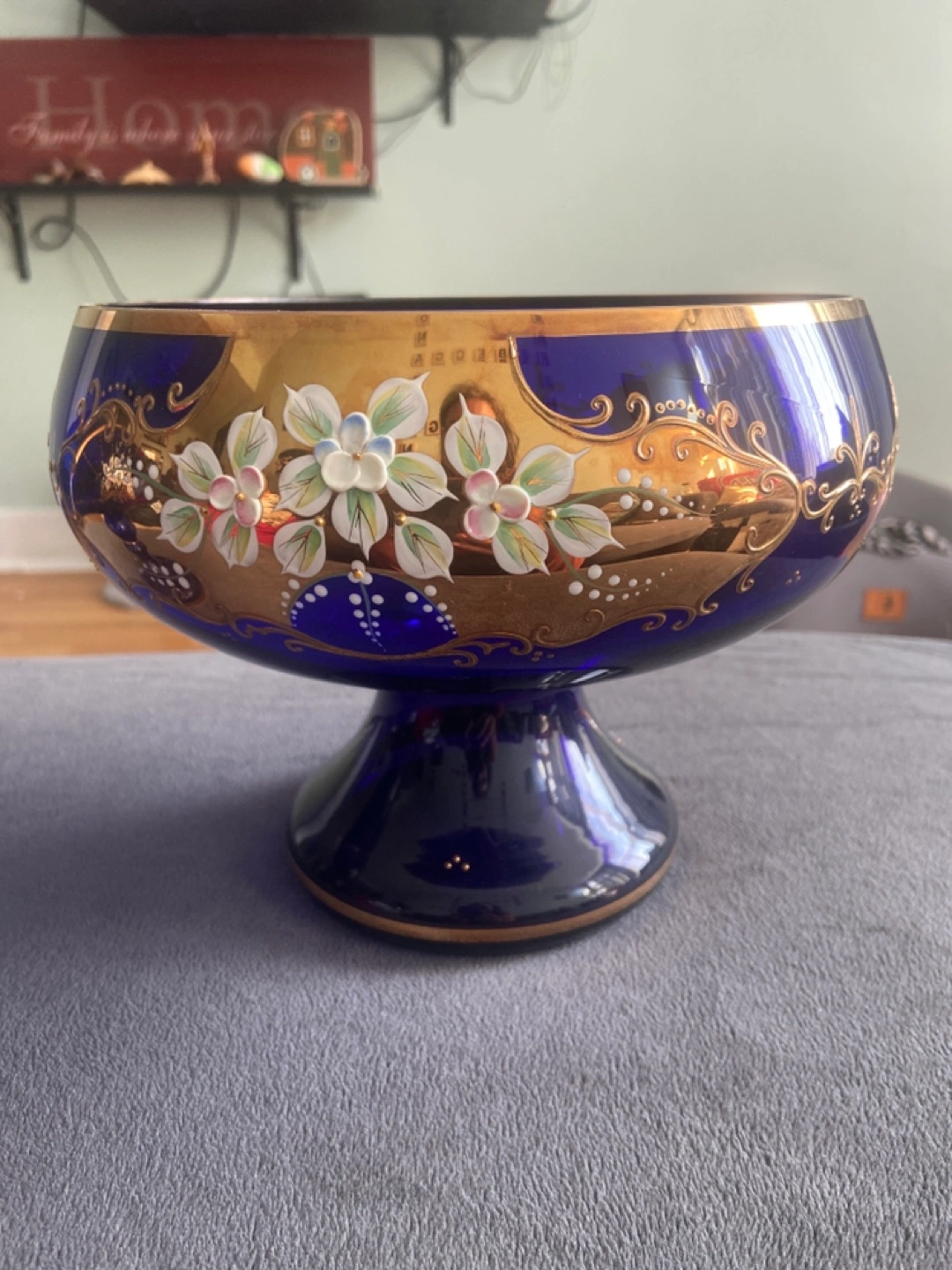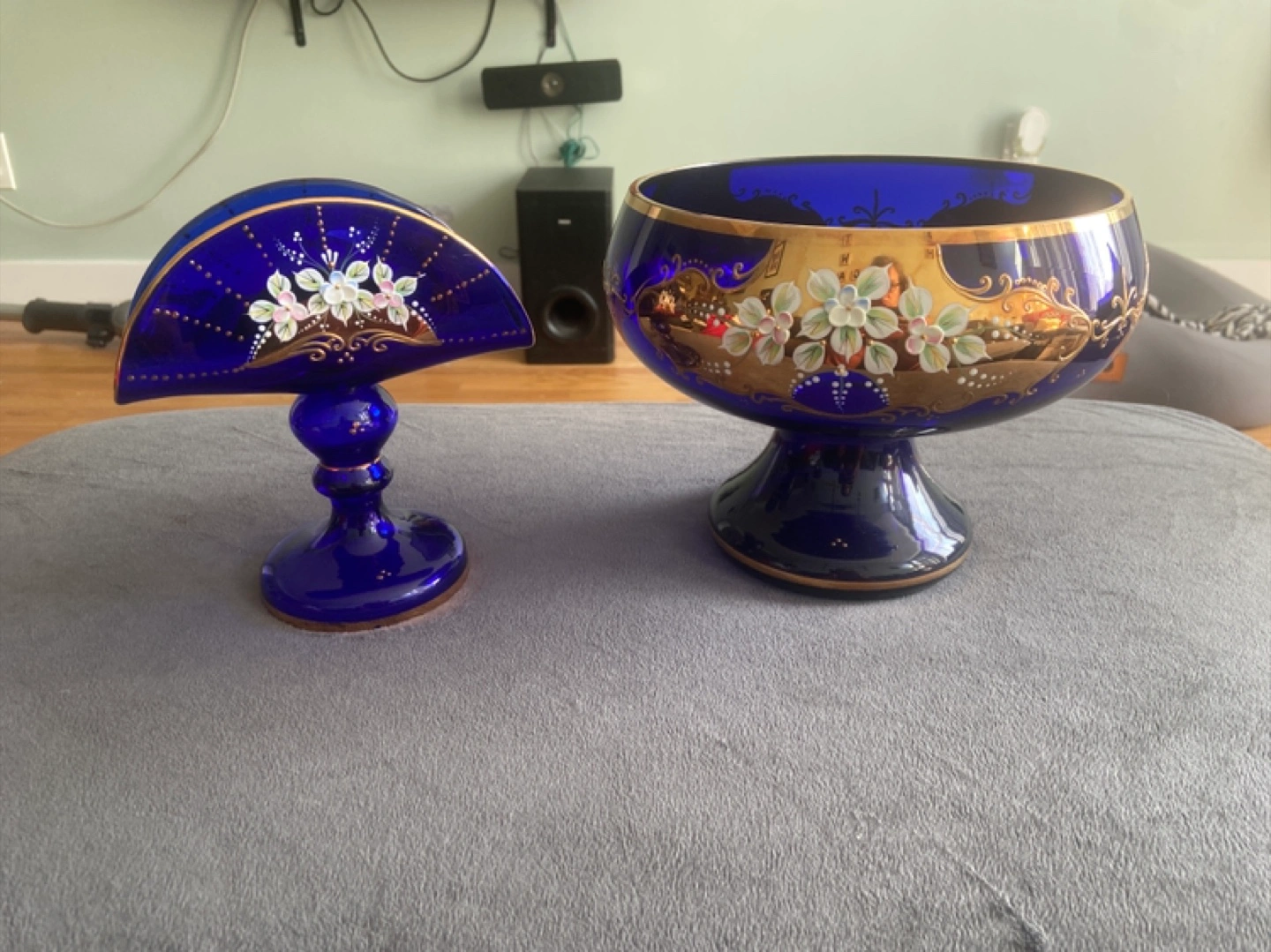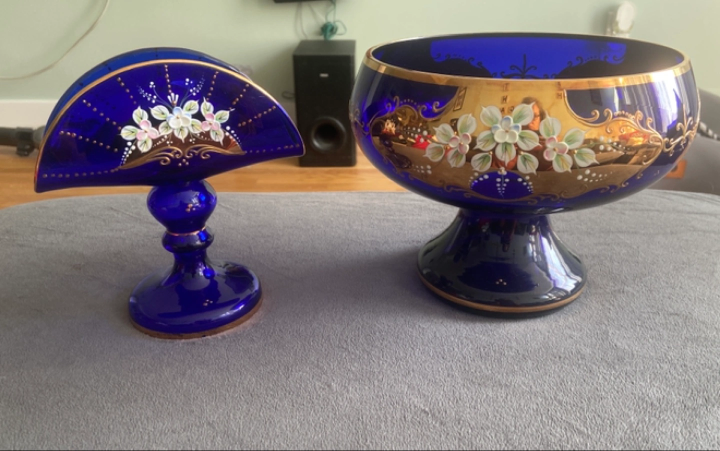 Selling a beautiful set of Slovakia Glass bowl and napkin holder. The set is hand decorated with a lovely floral design in gold, white, and pink on a rich blue glass. Perfect for adding a touch of elegance to your dining table or as a decorative piece in your home!