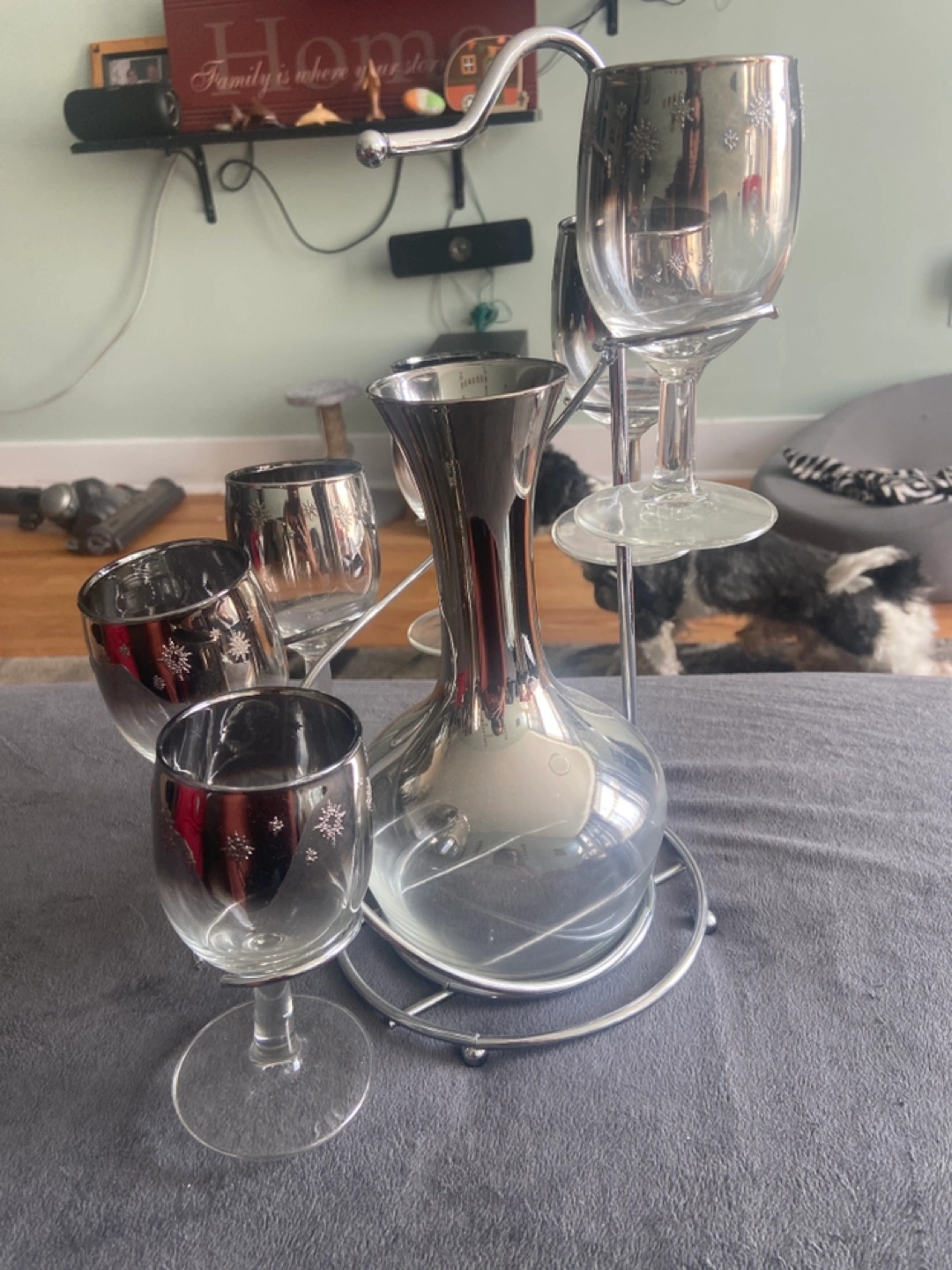 Selling a lovely silver wine decanter set! It comes with a decanter and several wine glasses, all featuring a delicate snowflake design. Perfect for adding a touch of elegance to your next dinner party or holiday gathering