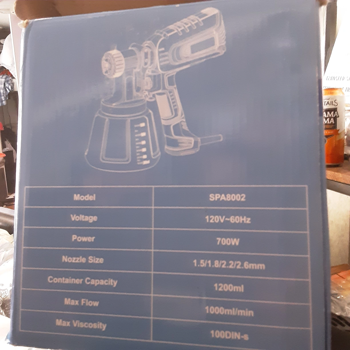 Selling an electric spray gun, model SPA8002! It's 700W and has a container capacity of 1200ml. The nozzle size is 1.5/1.8/2.2/2.6mm, and the max flow is 1000ml/min. Max viscosity is 100DIN-s