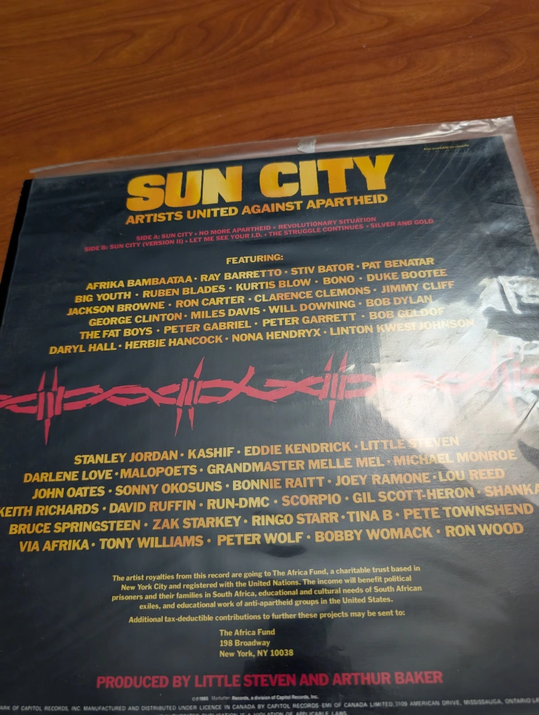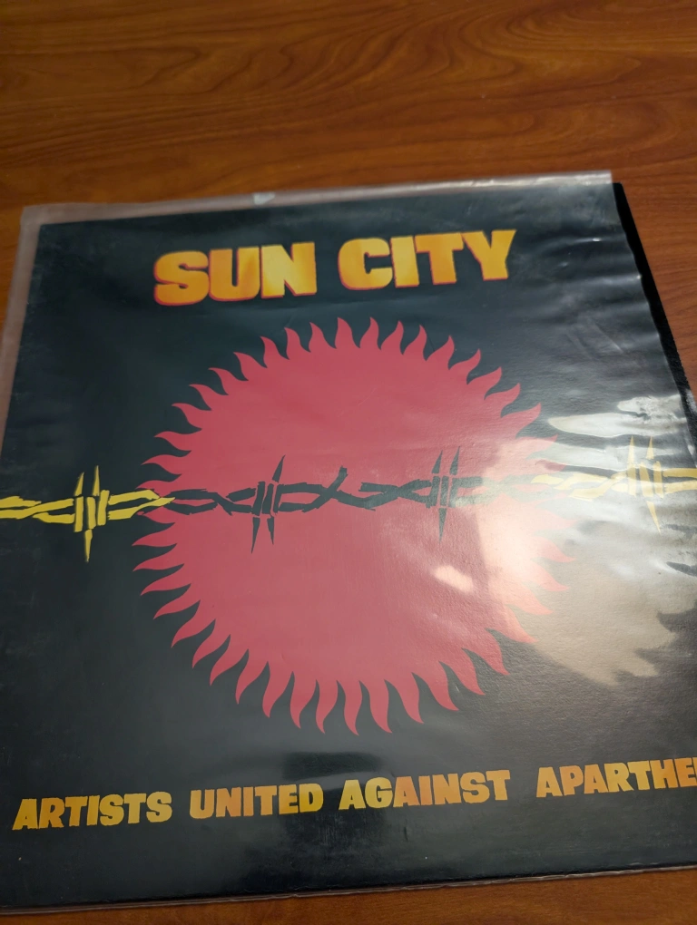 Selling a vinyl record of Sun City by Artists United Against Apartheid. This is a great piece for any music collector or anyone interested in the history of music and activism. The record features a wide array of artists. A must-have for your collection!