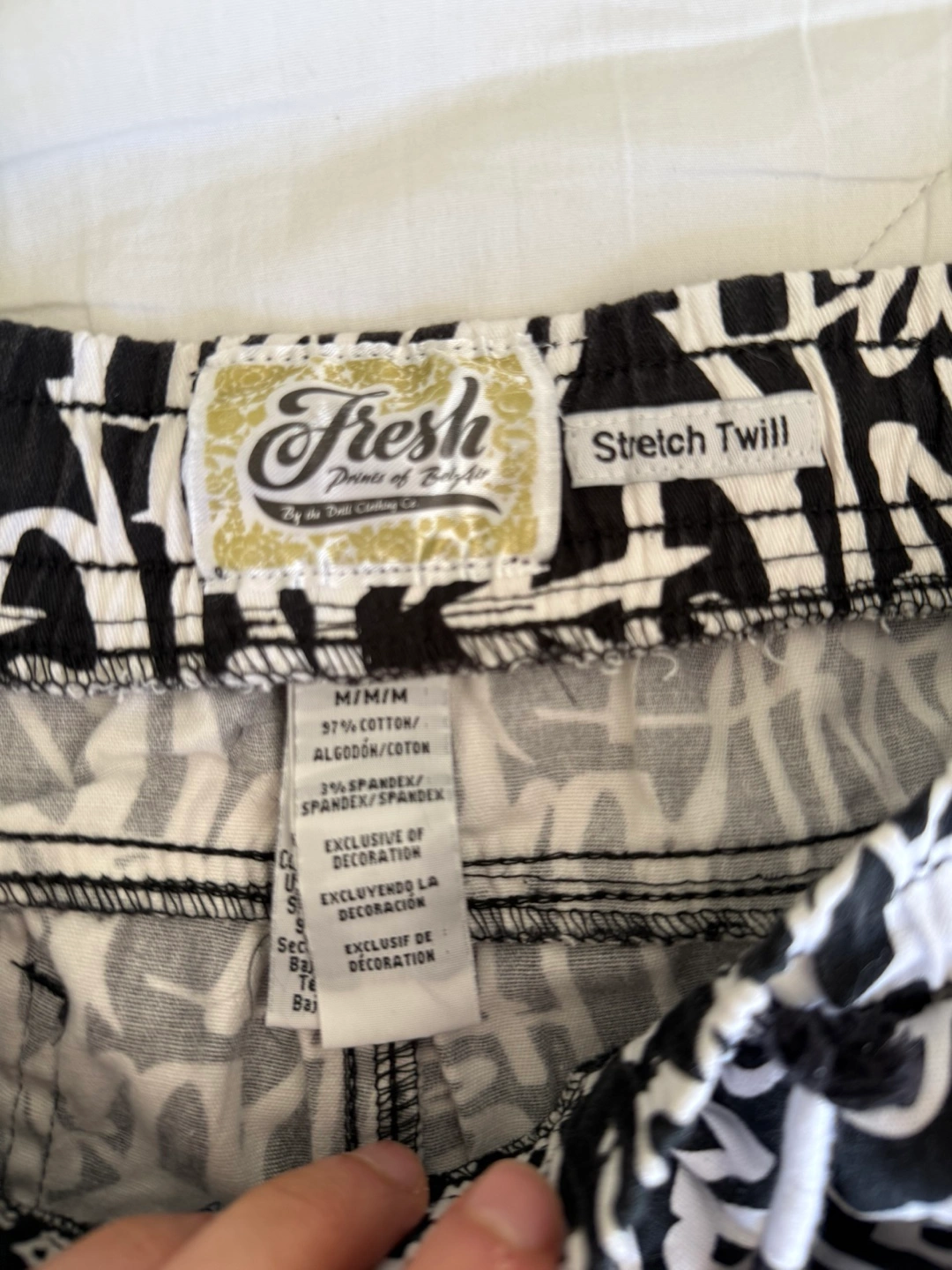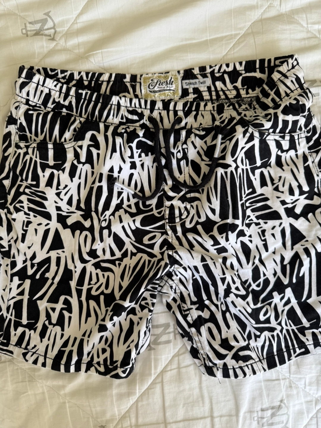 Selling a pair of Fresh Prints of Bel-Air shorts in size medium! These shorts feature a cool black and white graffiti-style print. They're made of 97% cotton and 3% spandex, making them comfy and stretchy. Perfect for a casual day out!