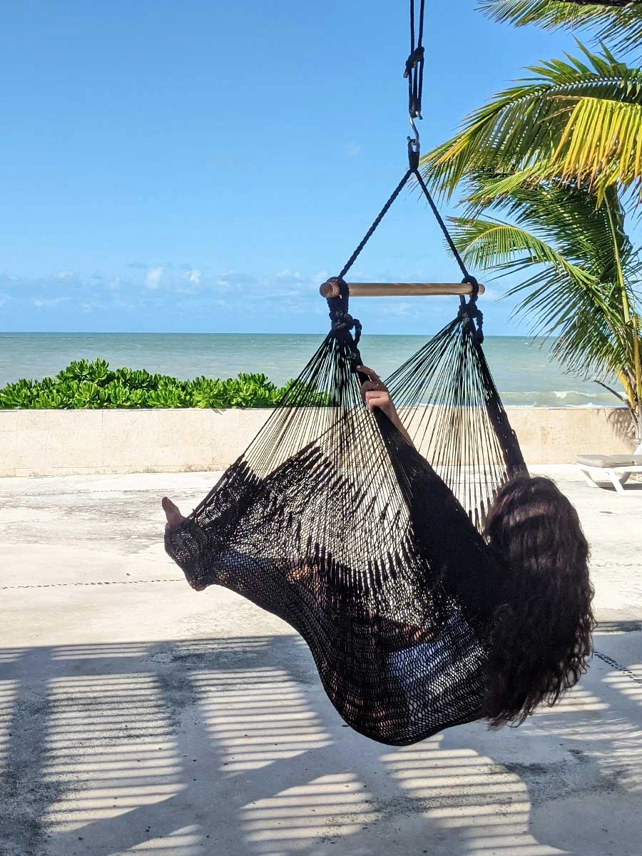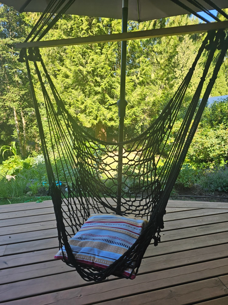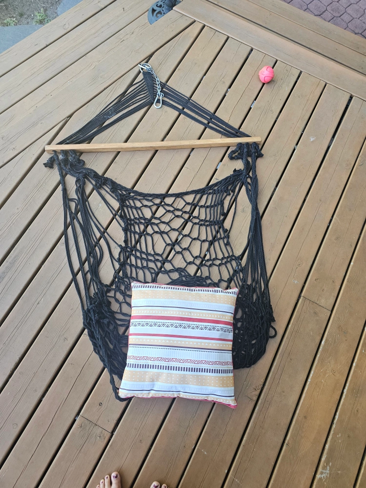 Selling a gently used hanging rope hammock chair! It's perfect for relaxing indoors or outdoors. It comes with a cushion for added comfort. Ready for a new home!