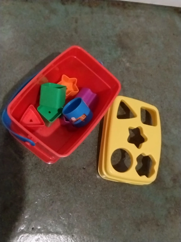 Shape sorting toy with a bucket to store the pieces. Great for toddlers learning shapes and colours! Includes various shapes like stars, triangles, and circles. Hours of fun for your little one