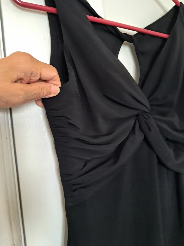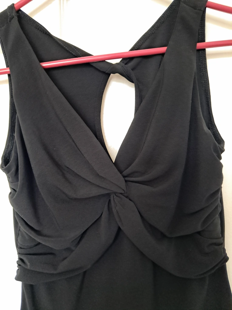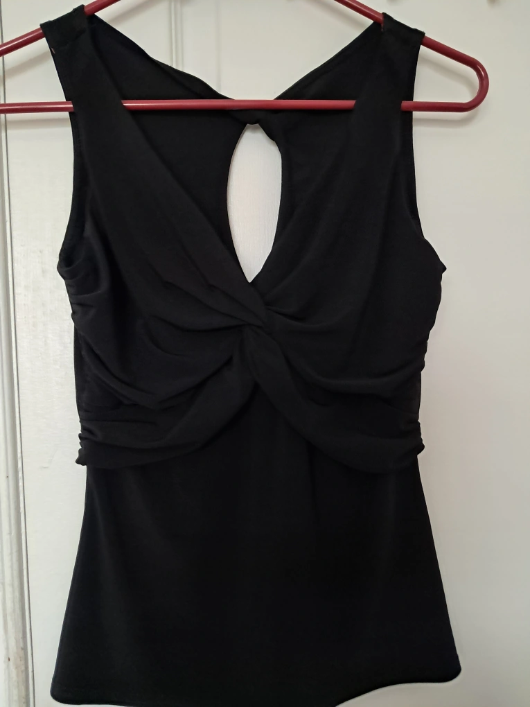 An elegant black sleeveless tank for a night out! It has a unique twisted detail in the front and a sexy back. Like new and ready for a new home