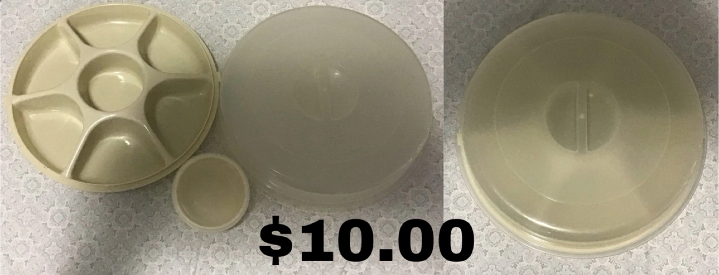 Selling a round serving dish with a lid. It's in a beige colour. Great for parties or get-togethers to keep your snacks fresh! As is. $10.00 exact cash only More info in second photo Must go now Great for your upcoming party