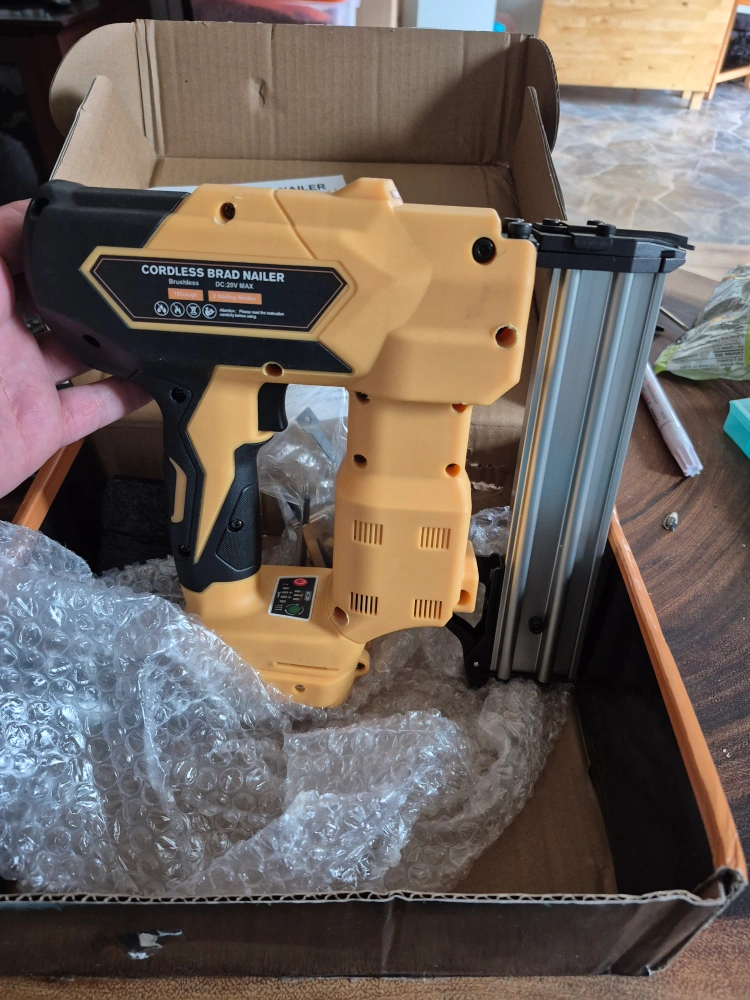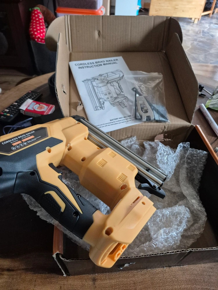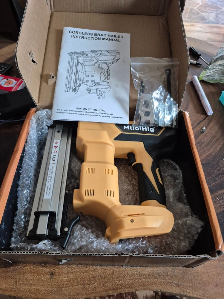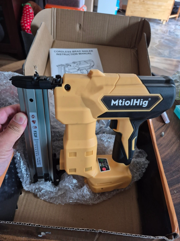 Selling a MtioHlg cordless 2" brad nailer. It's in like-new condition and comes with the original box and instruction manual. This 2-in-1 electric nail gun/staple gun is compatible with Dewalt 20V batteries (battery not included). Perfect for picture framing, renovation, ceiling trim moulding, and other carpentry DIY projects!