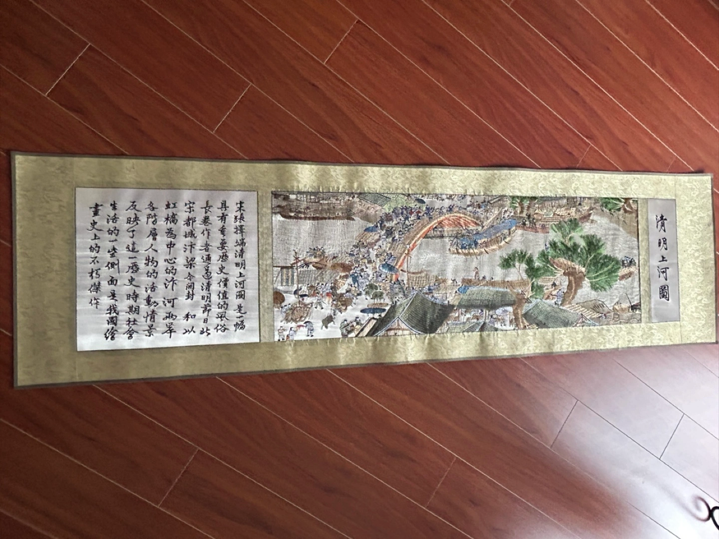 This is a beautiful scroll painting of the Qing Ming Shang He Tu (Along the River During the Qingming Festival). It depicts a vivid scene of life in Bianliang (now Kaifeng), the capital of the Northern Song Dynasty. A true piece of art!