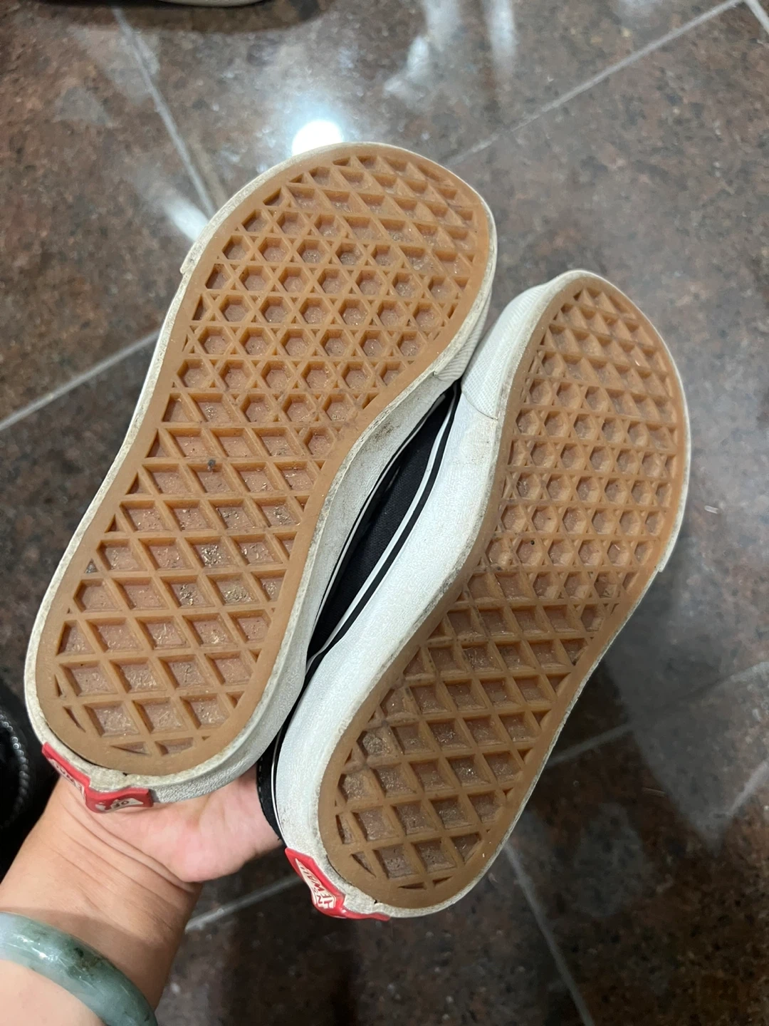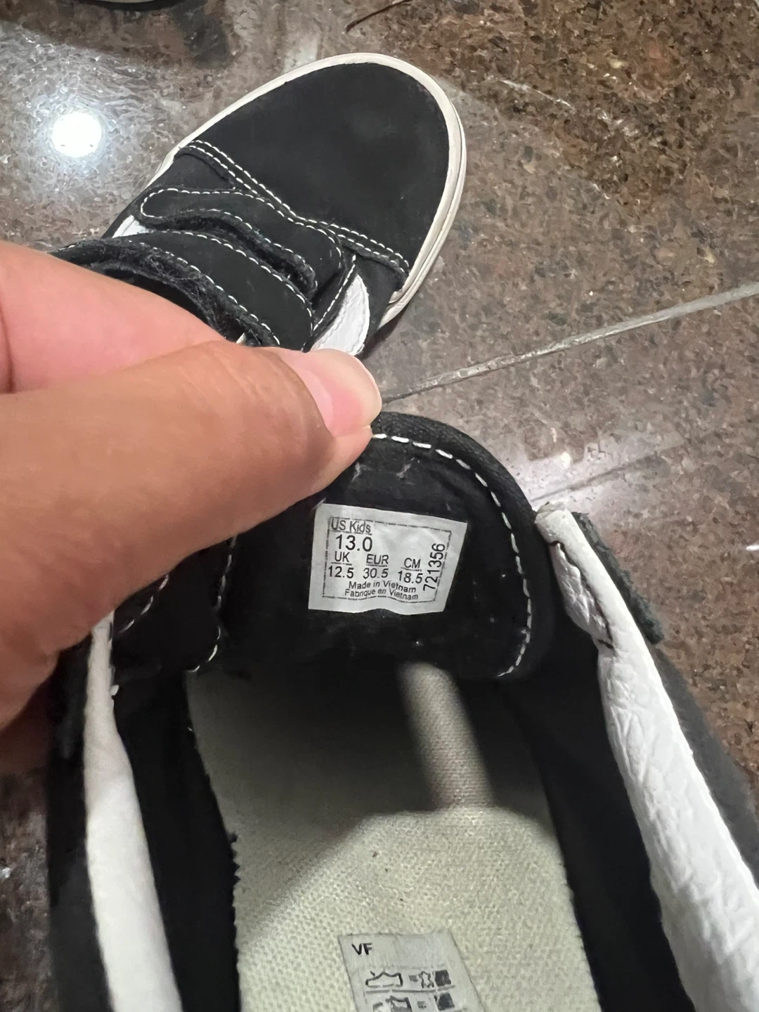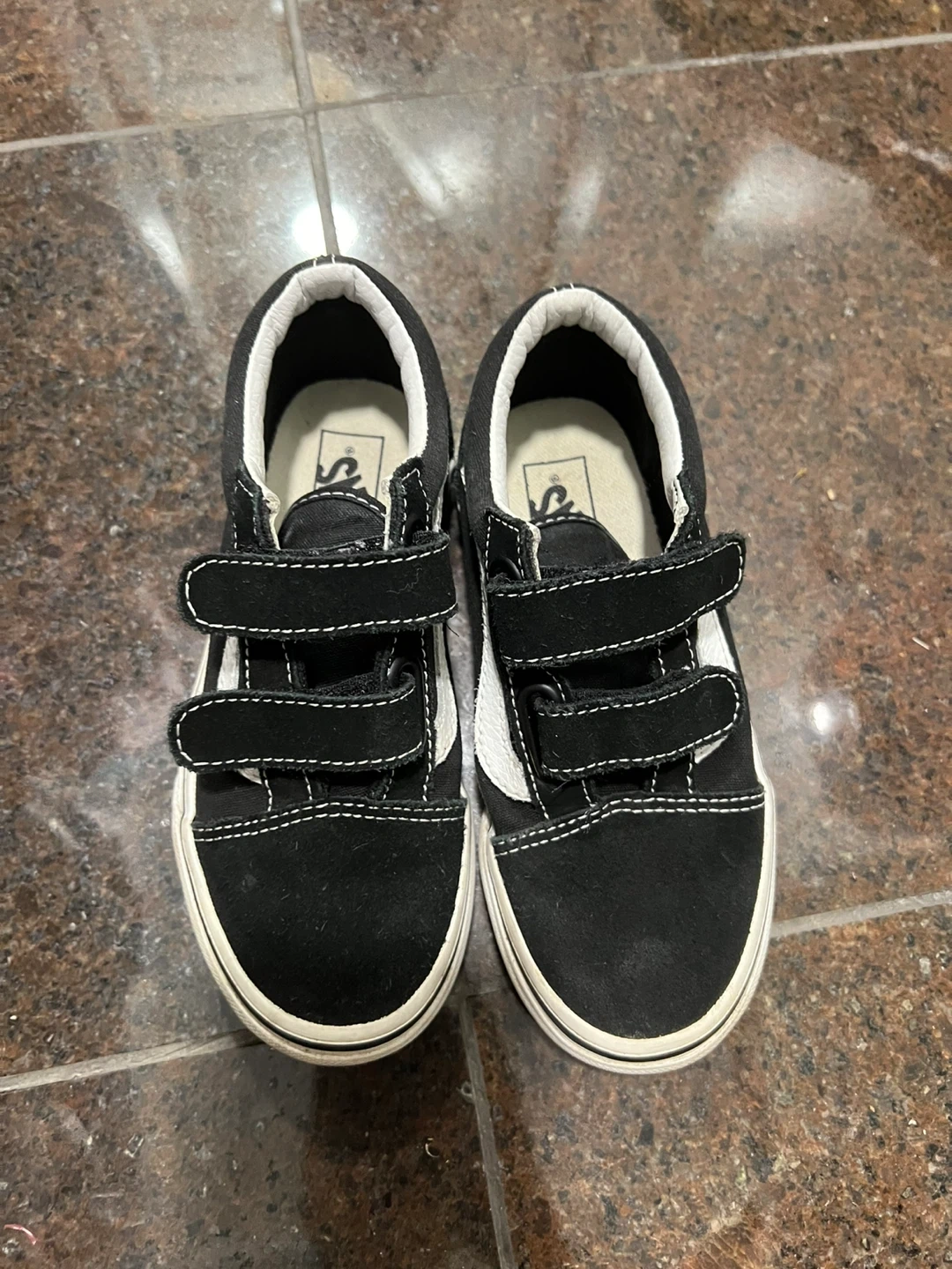 Selling a pair of Vans Old Skool sneakers for toddlers! They are black and white and in good used condition. Size is US 13. Please take a look at the photos to see the condition of the soles.