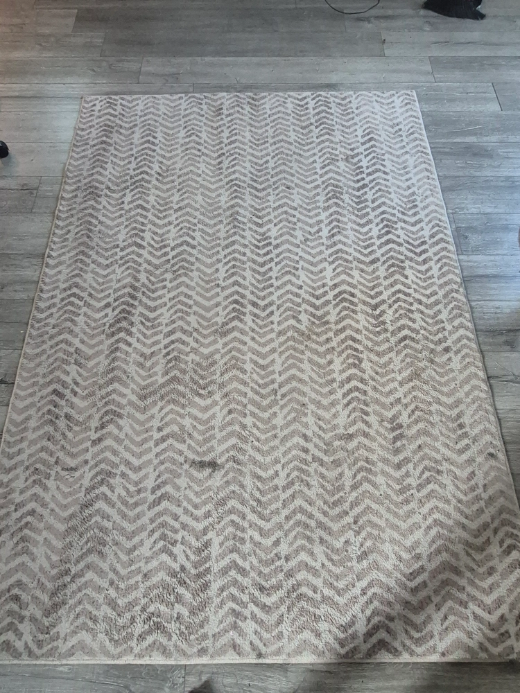 Selling a patterned area rug. It has a chevron design in neutral tones. Perfect for adding a touch of style to any room in your home!