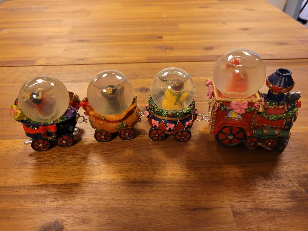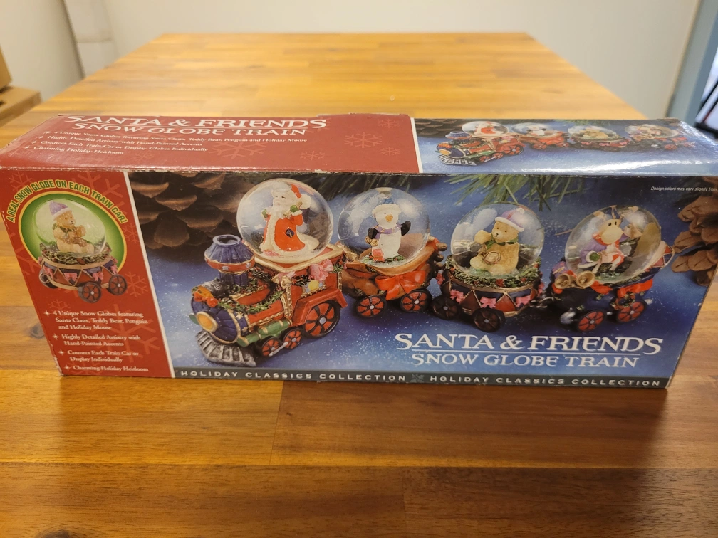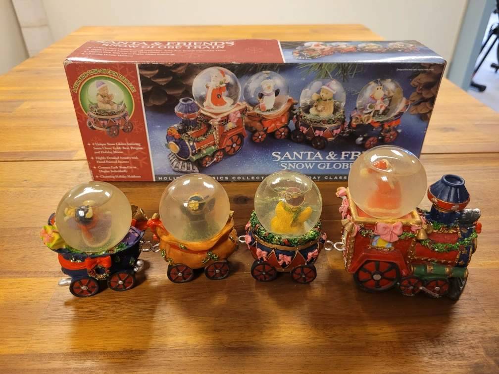 This is a new Santa & Friends Snow Globe Train from the Holiday Classics Collection It features: - 4 Unique Snow Globes featuring Santa Claus, Teddy Bear, Penguin and Holiday Moose - Highly Detailed Artwork with Hand Painted Accents - Connect Each Train Car or Display Globes Individually - Charming Holiday Heirloom * Pick up in store at 258 Main Street South, Newmarket (by appointment only to guarantee we are open). *** Payable by cash, debit or credit ***