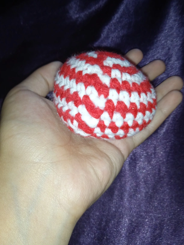 Here's a handmade crocheted hacky sack! It's red and white and in great shape. Perfect for juggling or just kicking around with friends!