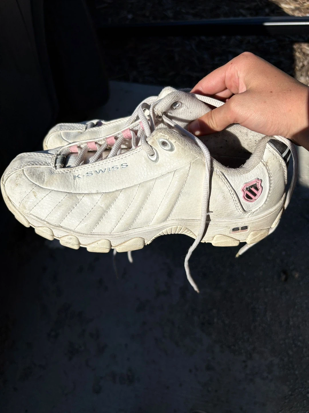 Selling a pair of K-Swiss sneakers! They are white with pink accents. They show some signs of wear, but still have lots of life left