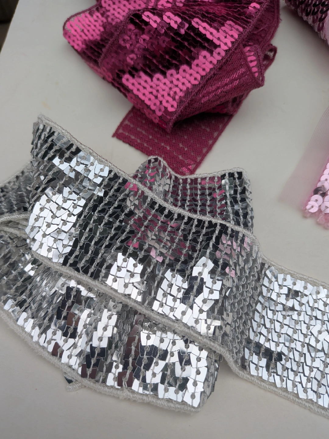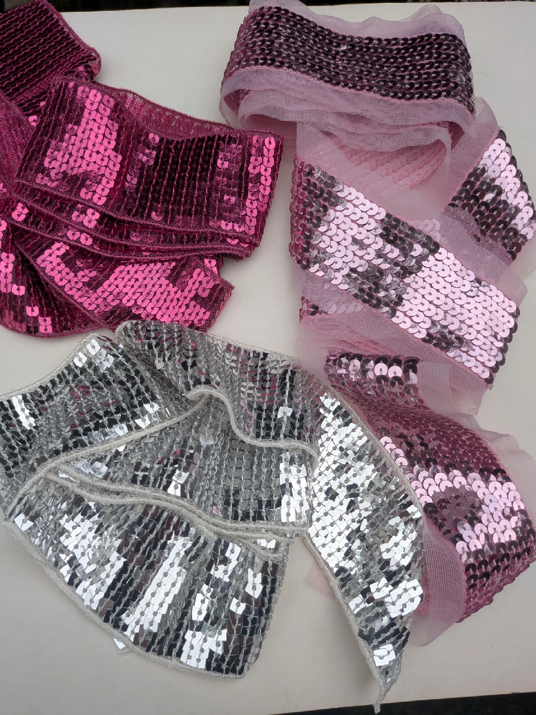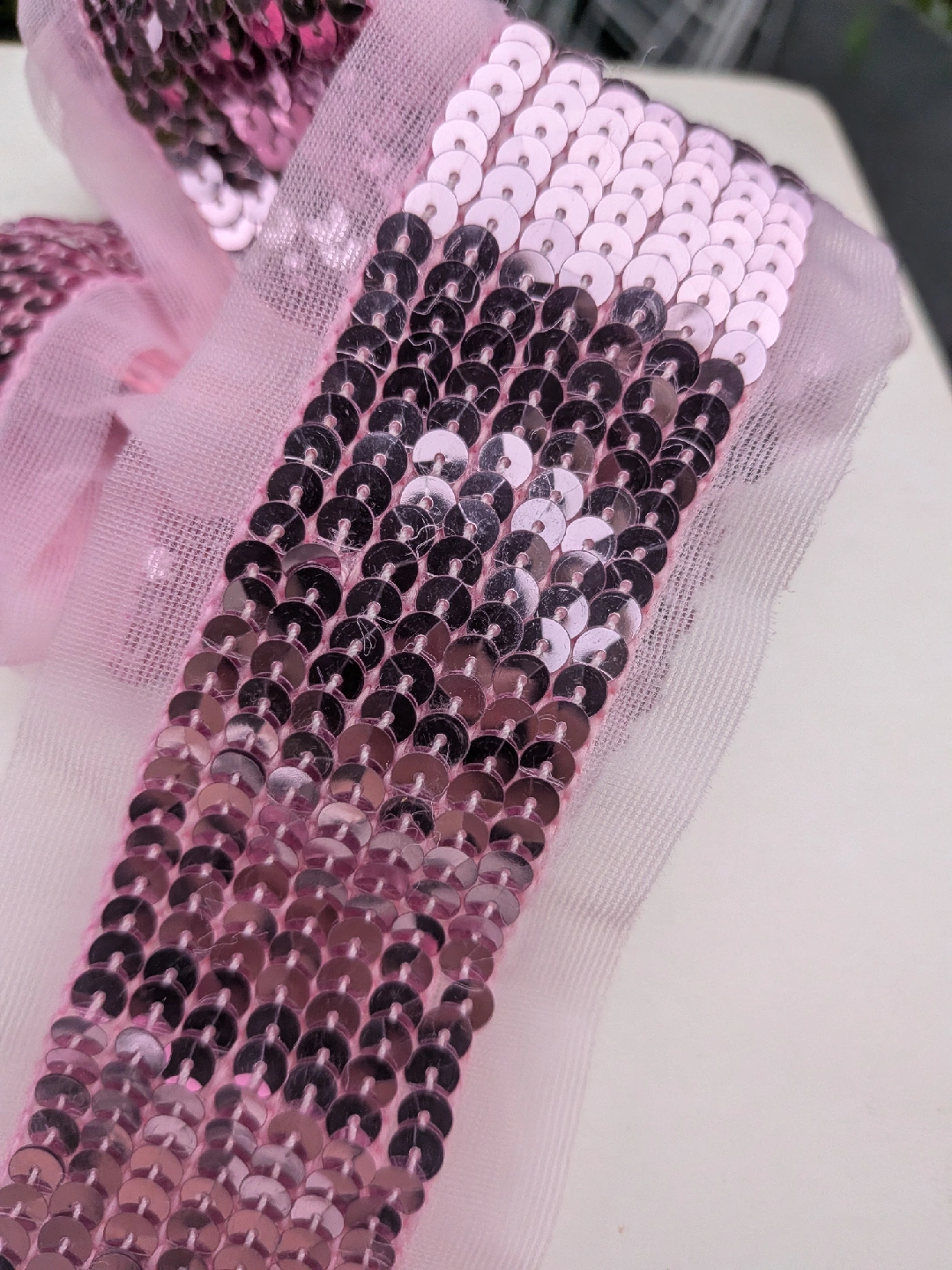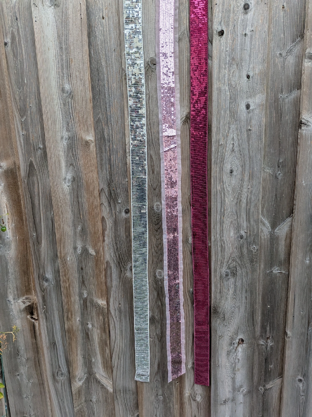 A collection of THREE very long sequin ribbons and one decorative flower in three colours: pink, silver, and fuschia. These are perfect for adding sparkle and flair to any crafting project or embellishment need. Get creative with these fun and vibrant accents! Good for headbands, wider pieces for scarves, sashes or used in sewing garments and other projects All have finished edges, not rough cut All measure about 62 inches long, almost 2 yards ** Mannequin head NOT for sale CASH ONLY, NO ETRANSFERS MEET UP: ETOBICOKE. RATHBURN RD AND RENFORTH DR INTERSECTION