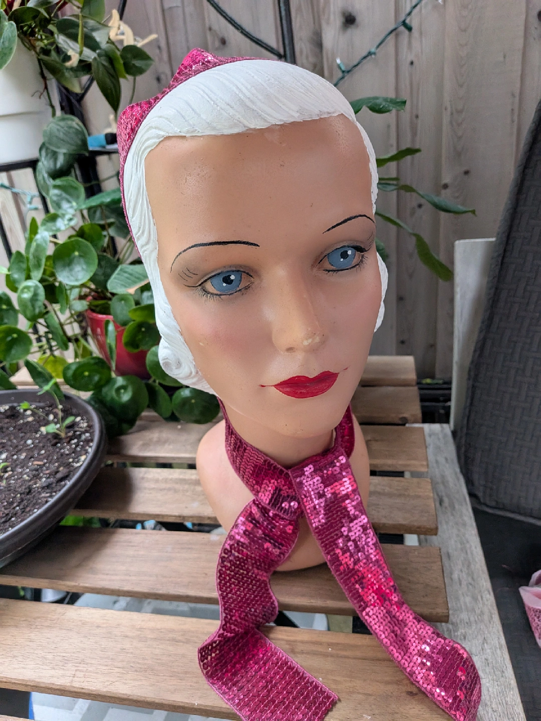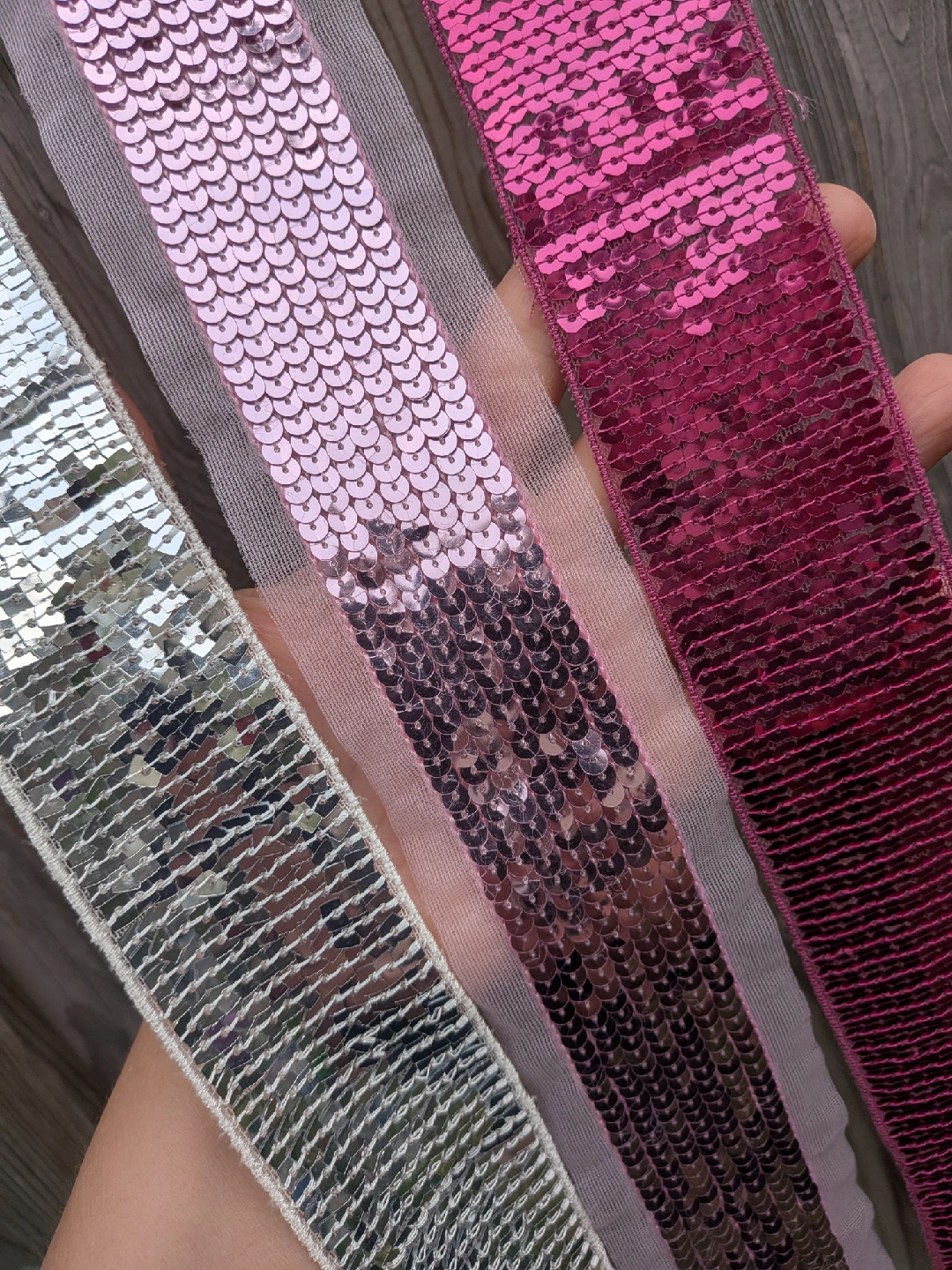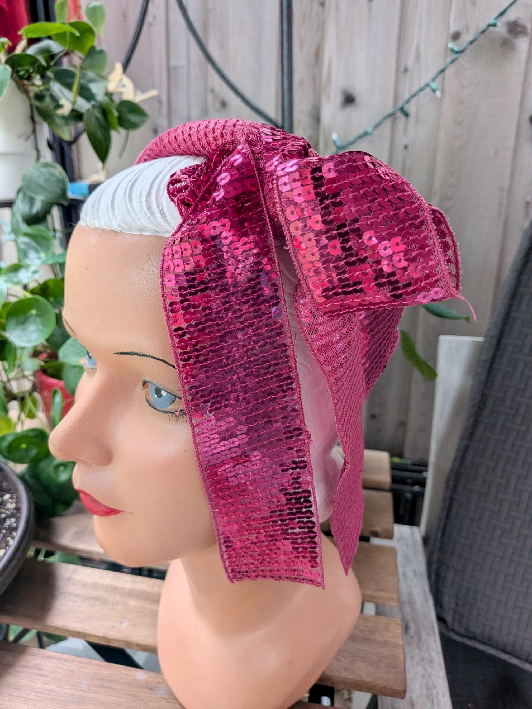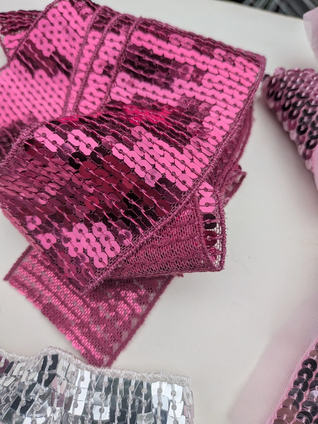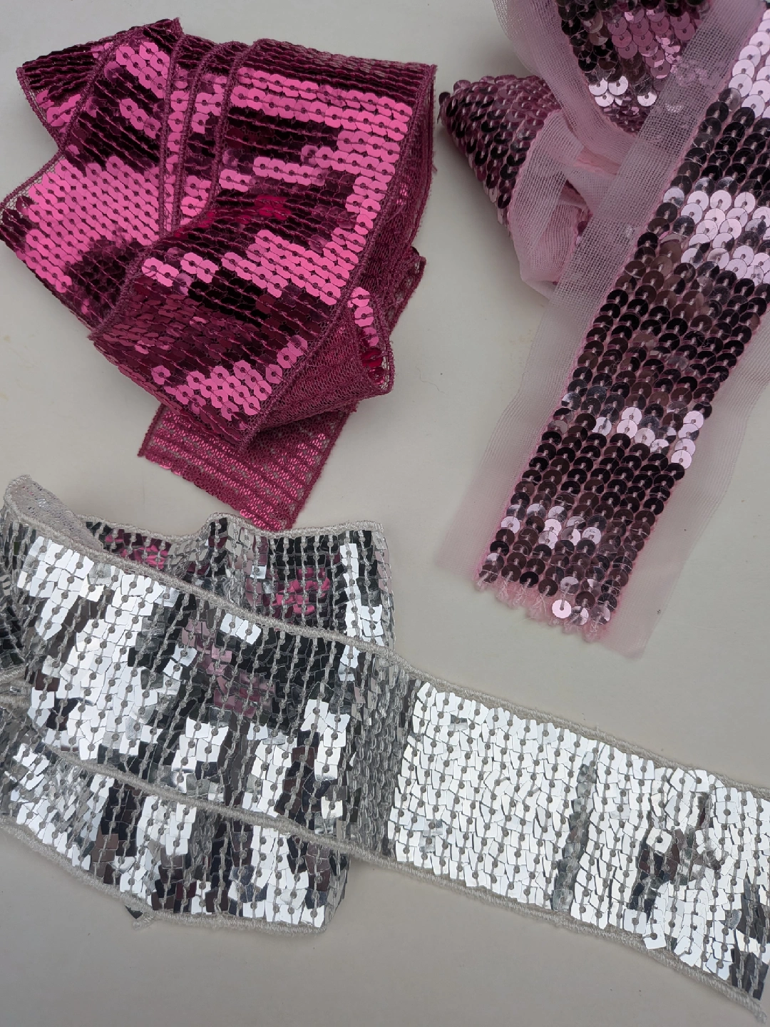 A collection of THREE very long sequin ribbons and one decorative flower in three colours: pink, silver, and fuschia. These are perfect for adding sparkle and flair to any crafting project or embellishment need. Get creative with these fun and vibrant accents! Good for headbands, wider pieces for scarves, sashes or used in sewing garments and other projects All have finished edges, not rough cut All measure about 62 inches long, almost 2 yards ** Mannequin head NOT for sale CASH ONLY, NO ETRANSFERS MEET UP: ETOBICOKE. RATHBURN RD AND RENFORTH DR INTERSECTION