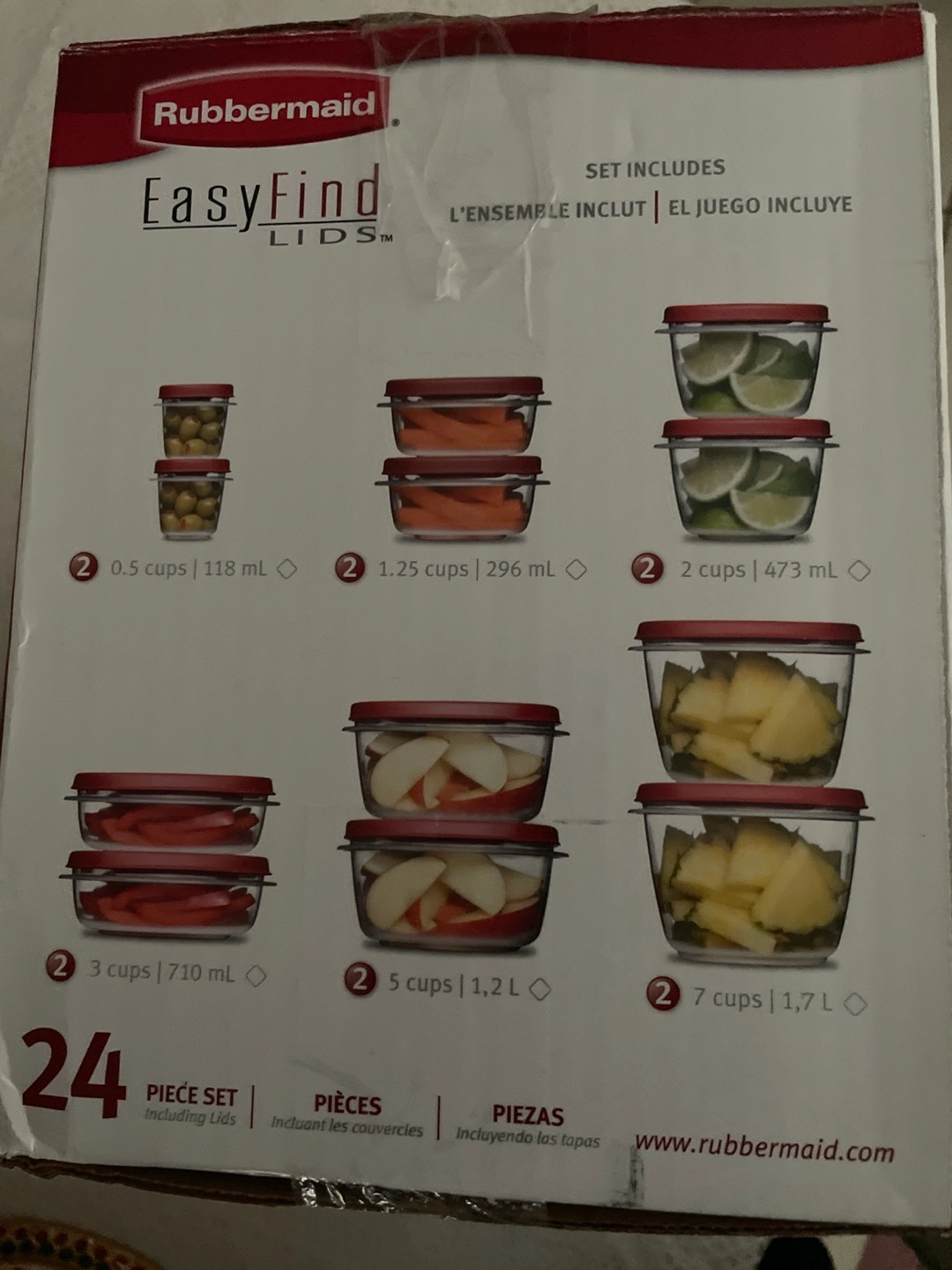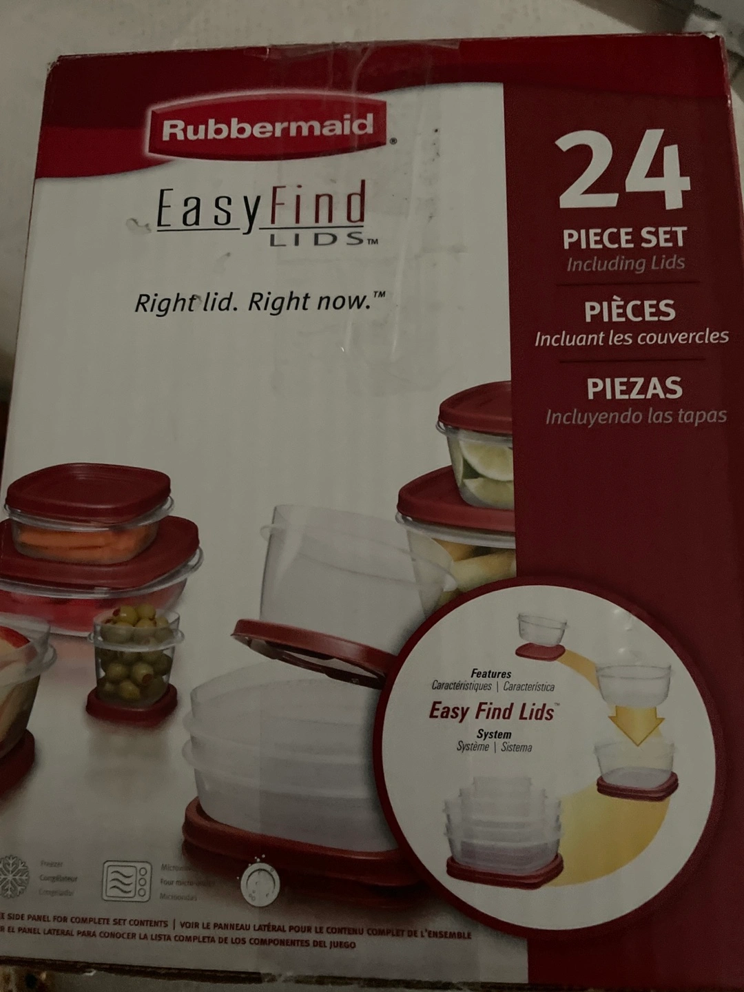 Selling a brand new Rubbermaid EasyFindLids 24-piece set! This set features lids that snap to the base and to each other, making organization a breeze. Bases and lids nest inside each other, saving space in your cupboards. The containers are microwave and freezer safe. One lid fits multiple bases, adding to the convenience!